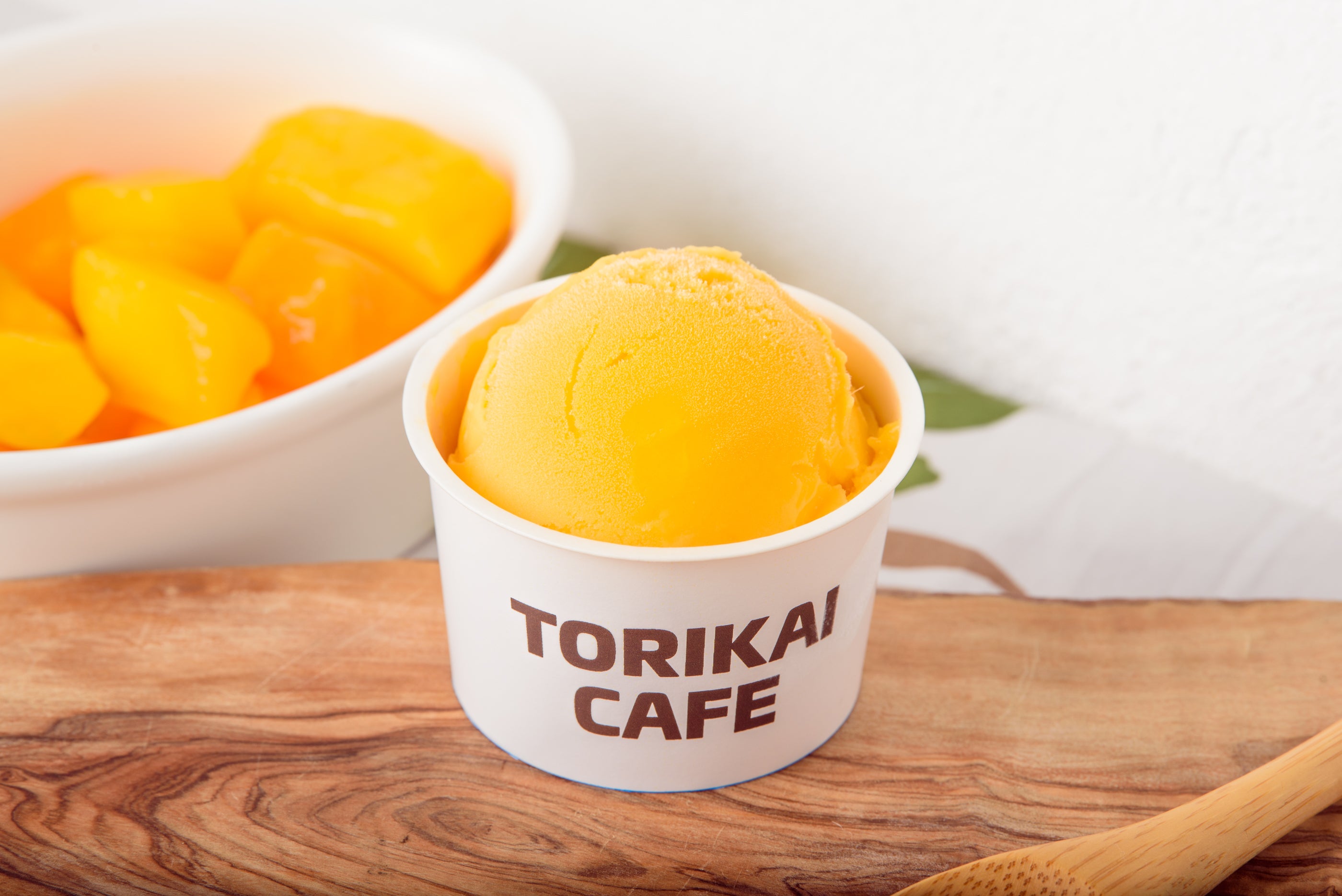 マンゴーソルベの柔らかさは、果肉そのものです。全体の分量の約60%ものマンゴー果肉を使用しているため、実は一番材料がリッチです。マンゴーよりもマンゴーっぽいね、という評価をいただいたので「とろけるマンゴーソルベ」という名前にしました。