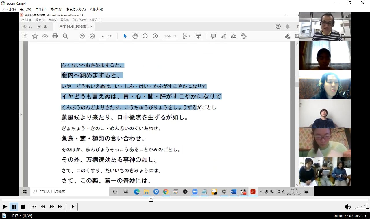 9月からはzoom稽古、10月からは毎週土曜日に感染予防を徹底しフェイスシールドを曇らせながら対面稽古を行いました。月.水.金はzoomで、滑舌、朗読、早口言葉などの基礎トレーニングを行ってきました。