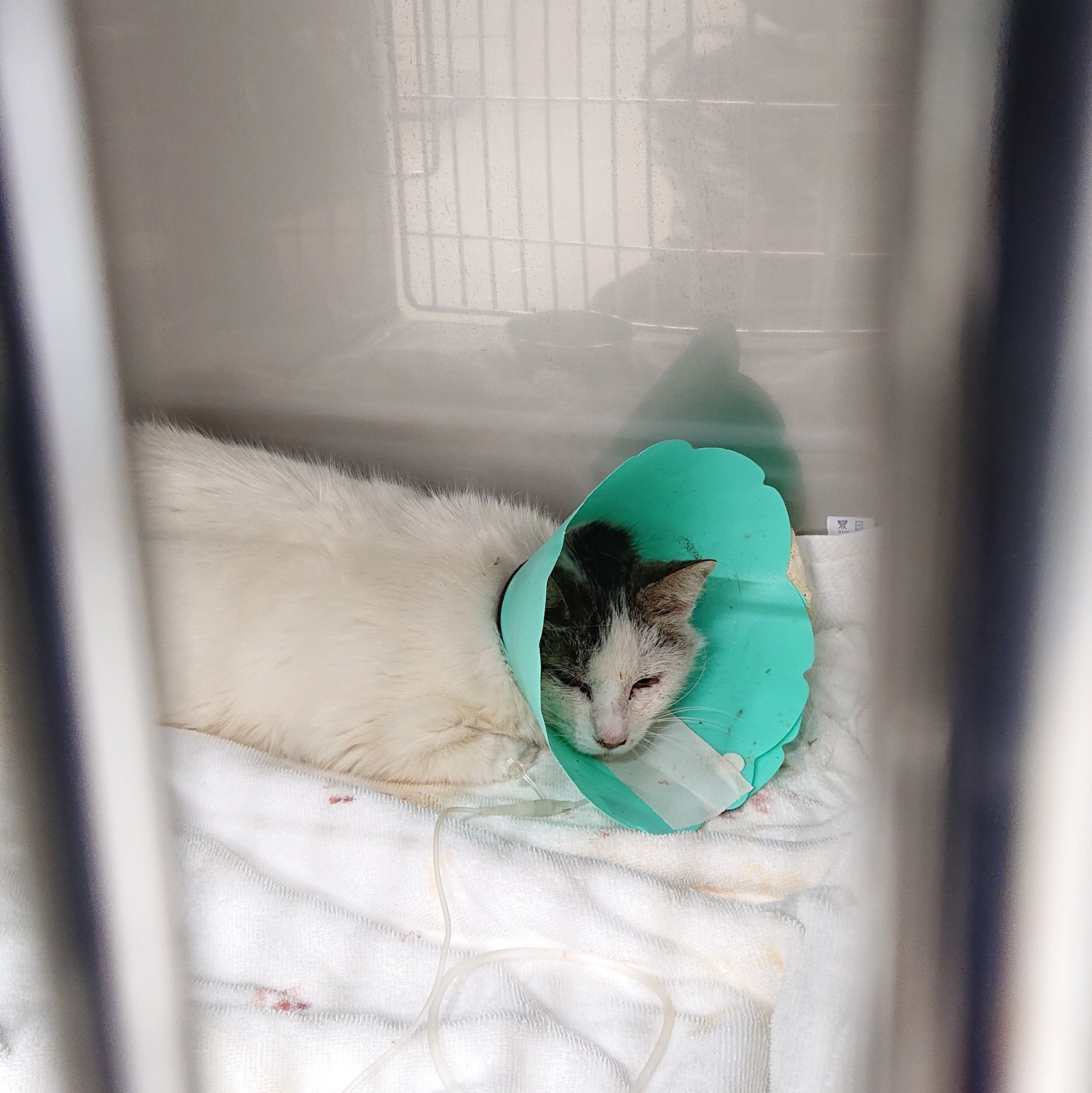 ママ猫ちゃんにさっき面会してきました。手術頑張ったね。吸収糸を使っていないため、抜糸まで入院させてくださることになりました。先生も看護師さんも、とてもしっかり診てくださるので安心です。その間に弱った身体を休めてね。