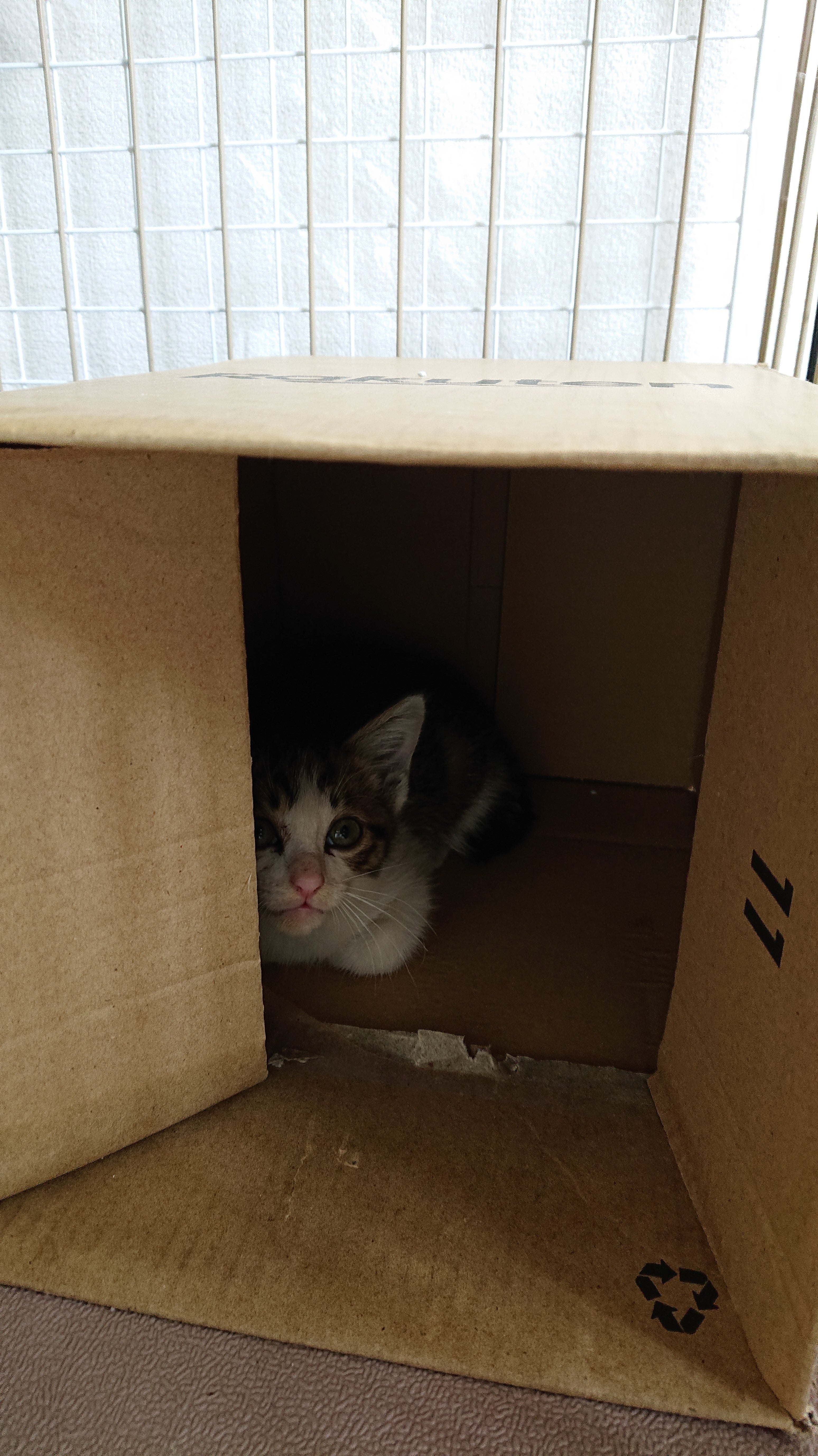 ネロ兄弟のワクチンが済んでいないため、迷いました。でも、自宅でお世話できないか聞くと、外に放したらダメ?と言われ、聞くと拳2つぶんぐらいの小さな仔猫です。放してしまったら、事故や餓え、カラス等に襲われて死んでしまう可能性が高いでしょう。ネロ兄弟の保護主さんに相談し、別々のケージで消毒を徹底することで、その仔猫を引き受けることにしました。