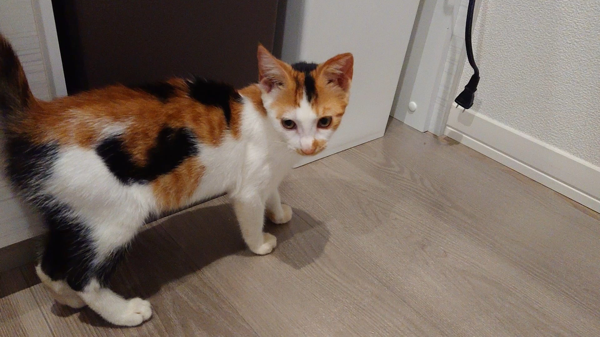 先日の活動報告に少し書かせていただきましたが、先週の木曜日に保護された子で、生後3ヶ月程度の女の子です。