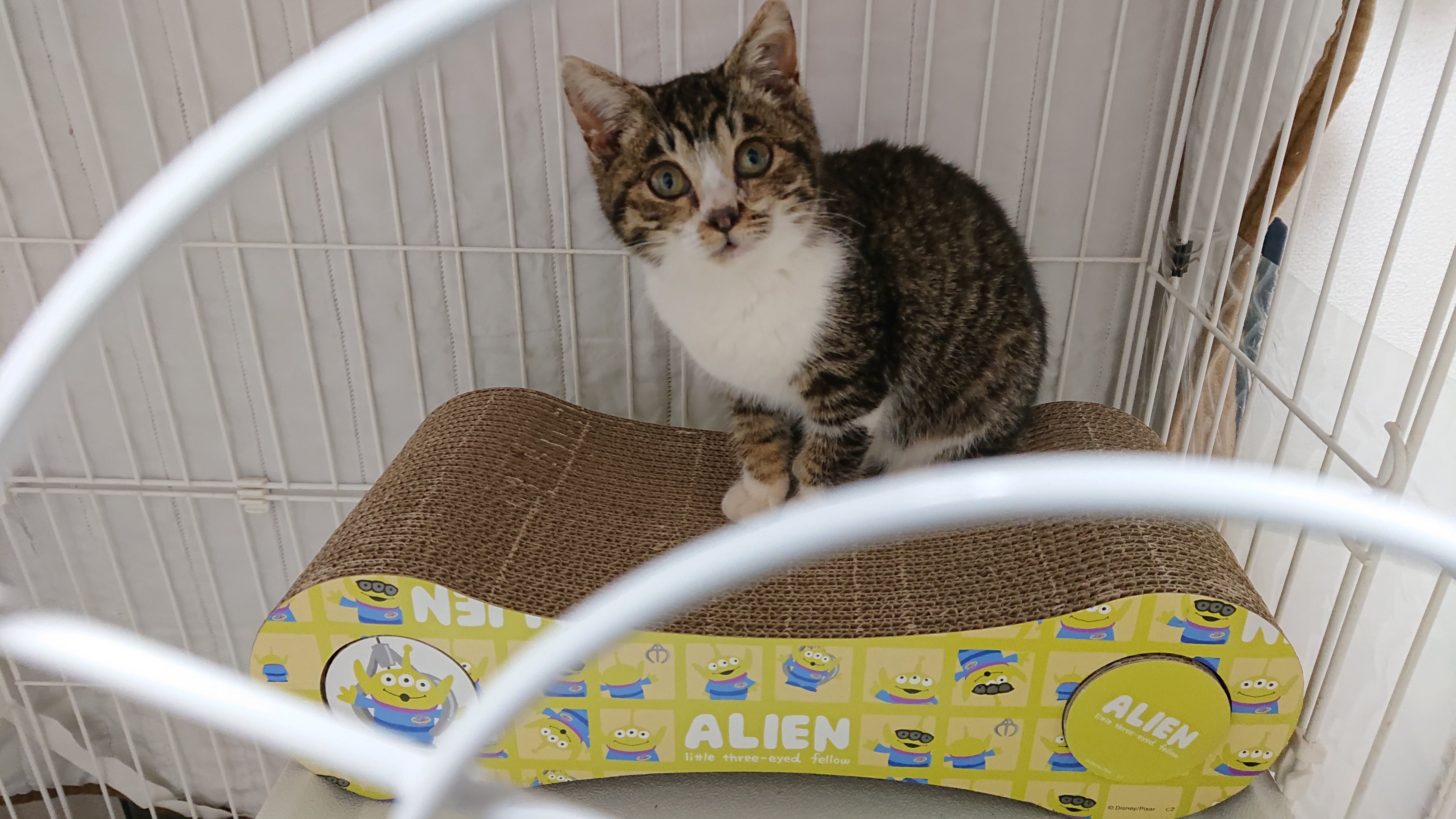 あられとみーちゃんに爪研ぎを置いてみました。みーちゃんはまだ2段目に上れませんが、あられは上手に爪研ぎしています。