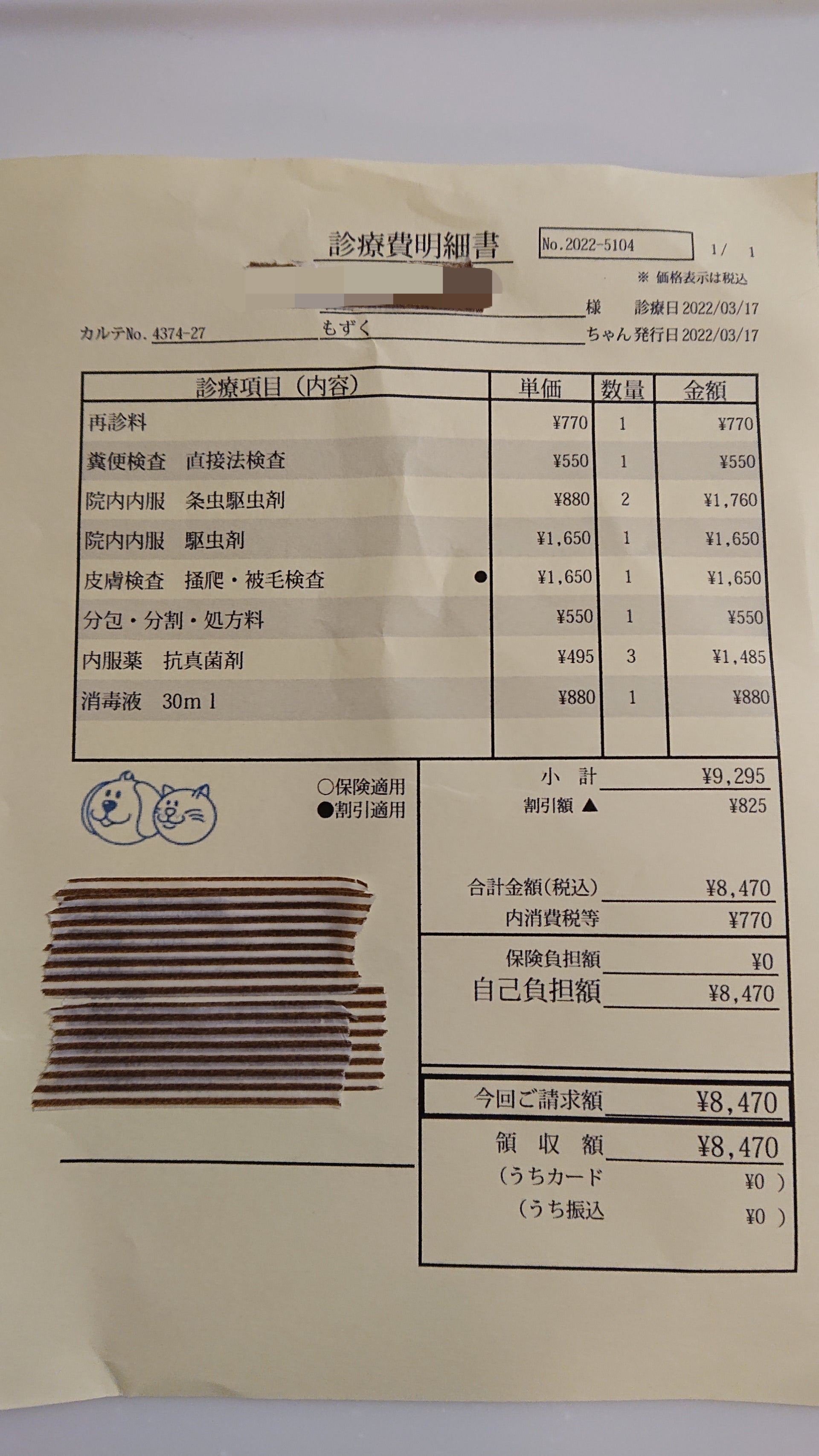 あとは頭の一部の毛が抜けており、カビでした。周りの毛を刈ってもらい、今日から消毒と内服です。広がってきませんように……。
