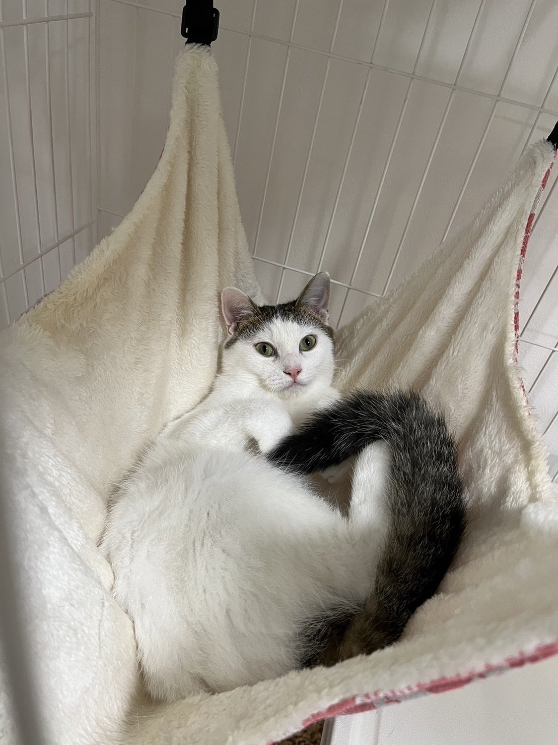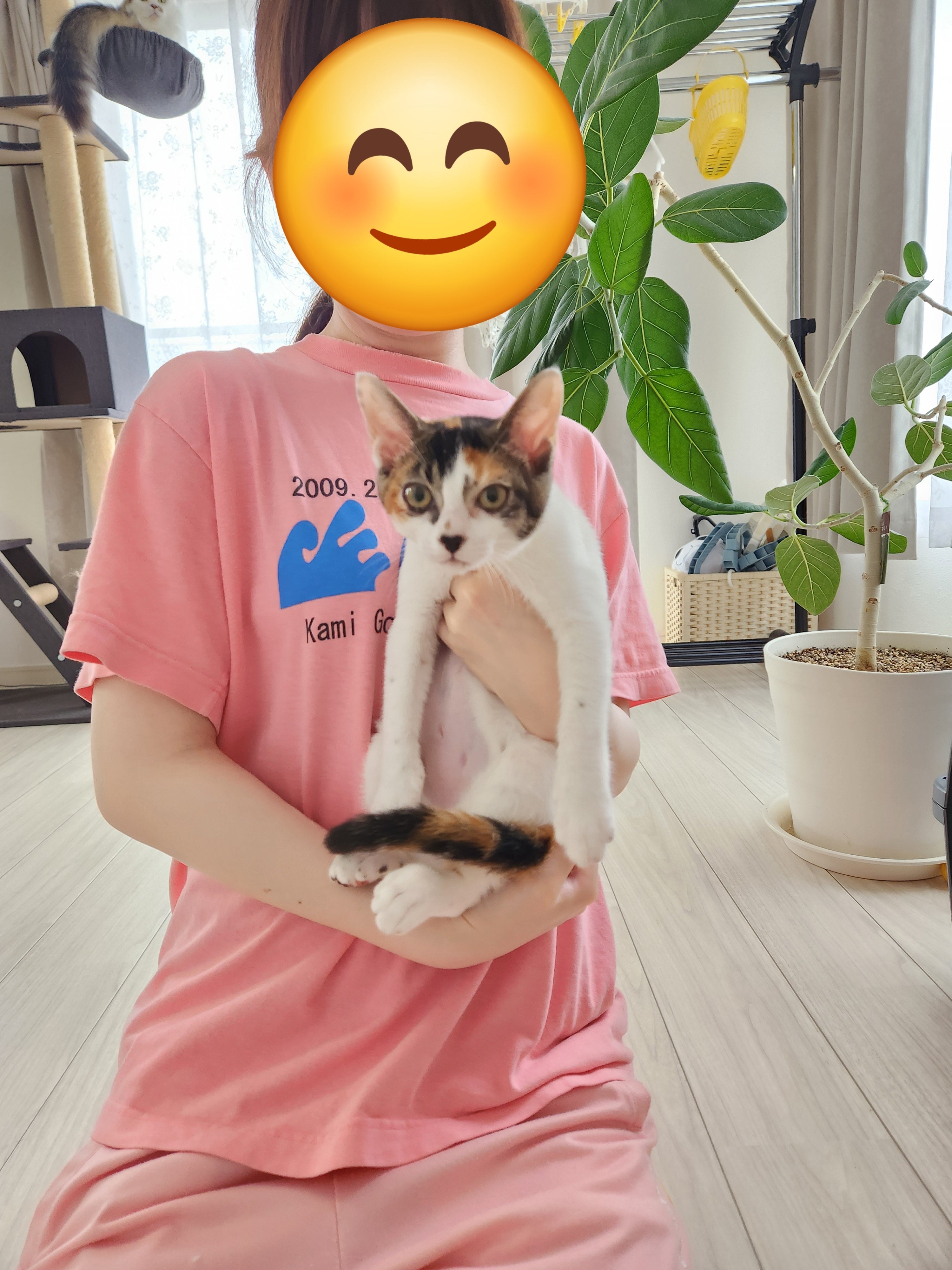 片道2時間かかり疲れてしまったようで、一時的に免疫が下がったのでしょう……。ピンちゃんの目が赤く腫れてしまい、結果結膜炎でした。デコちゃんと隔離して過ごすことになり、不安そうですが、里親様が毎日シャーシャーされて心折れながらも点眼を頑張ってくださり、かなり良くなってきました。