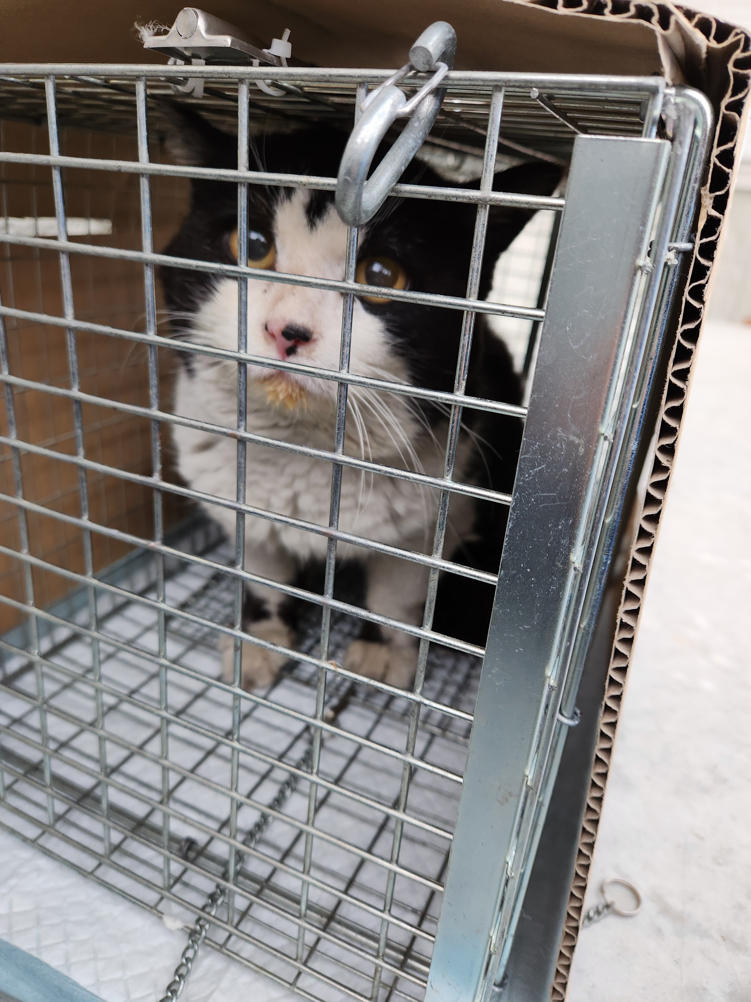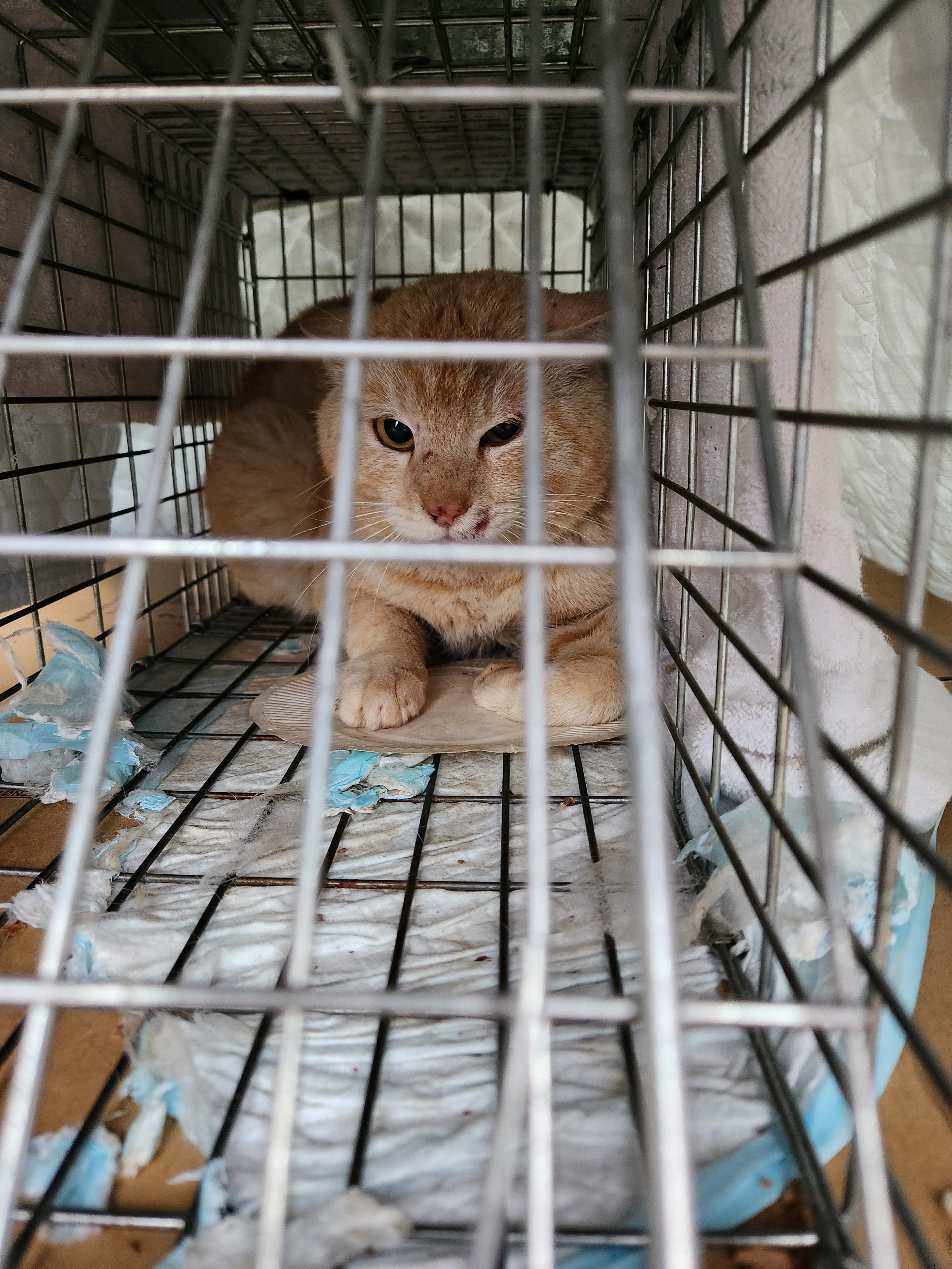 こんな状態でリリースはできない……でも今はみその捜索が優先であり、これ以上保護はできない。すごく悩みながらも、捕獲器ごしではあっても触らせてくれて、とても大人しい良い子です。なんとかできないかと、ボランティア仲間にお願いし、ケガが治るまでの静養期間の預かりをしていただけることになりました。