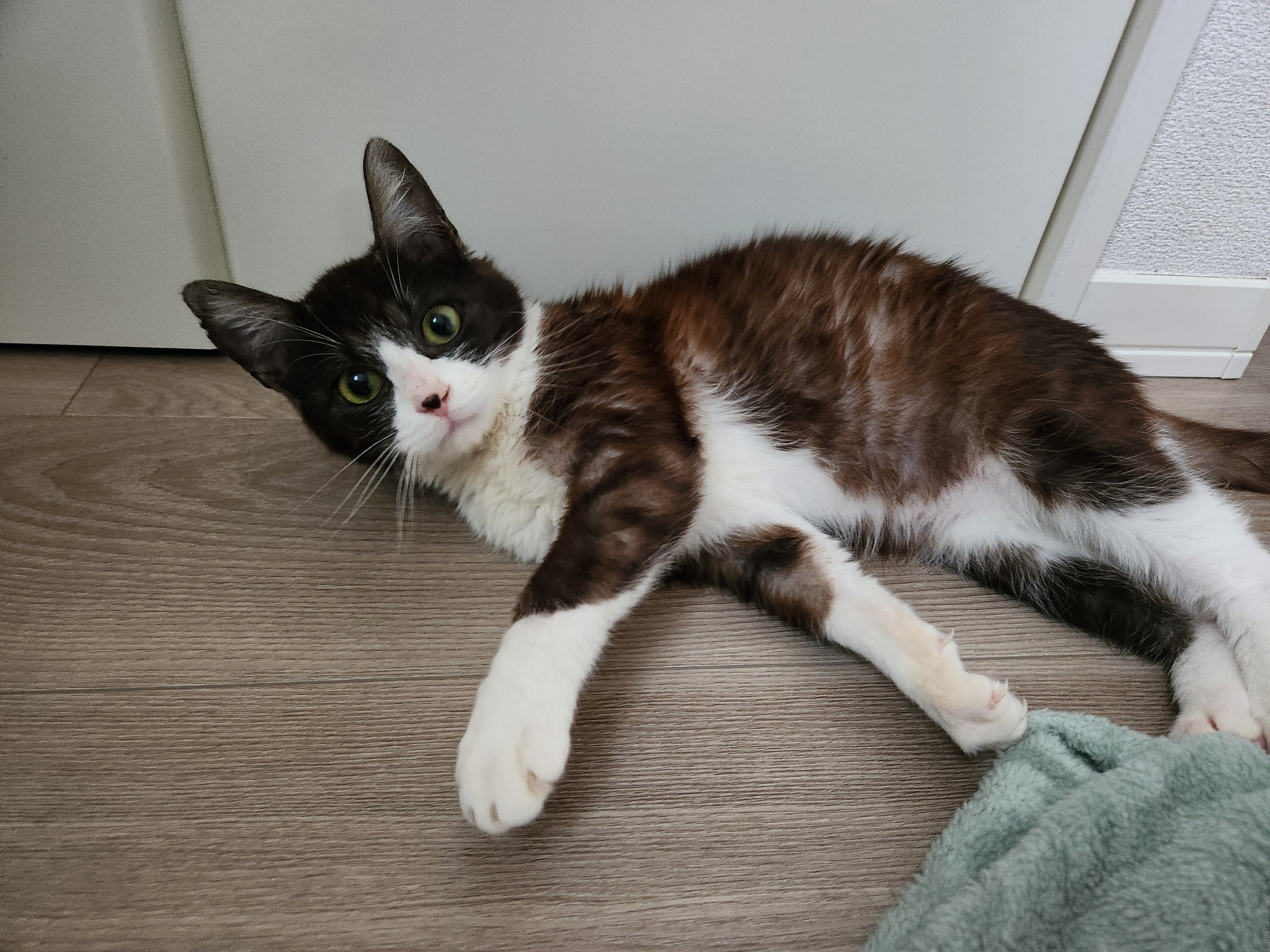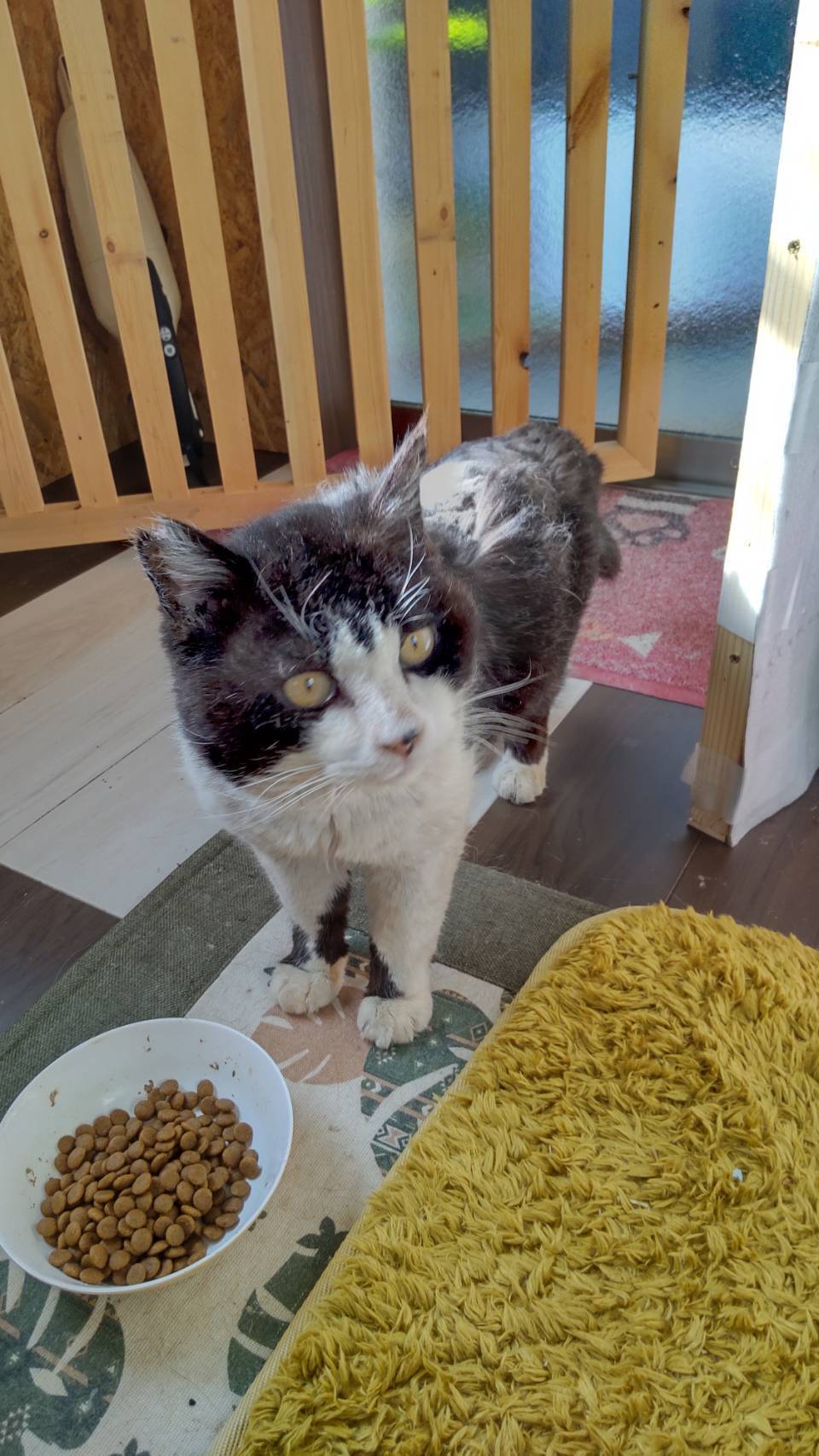 白黒くん、ケガはまだまだ治るのに時間がかかりますが、静養先でしっかりご飯を食べて過ごしています。