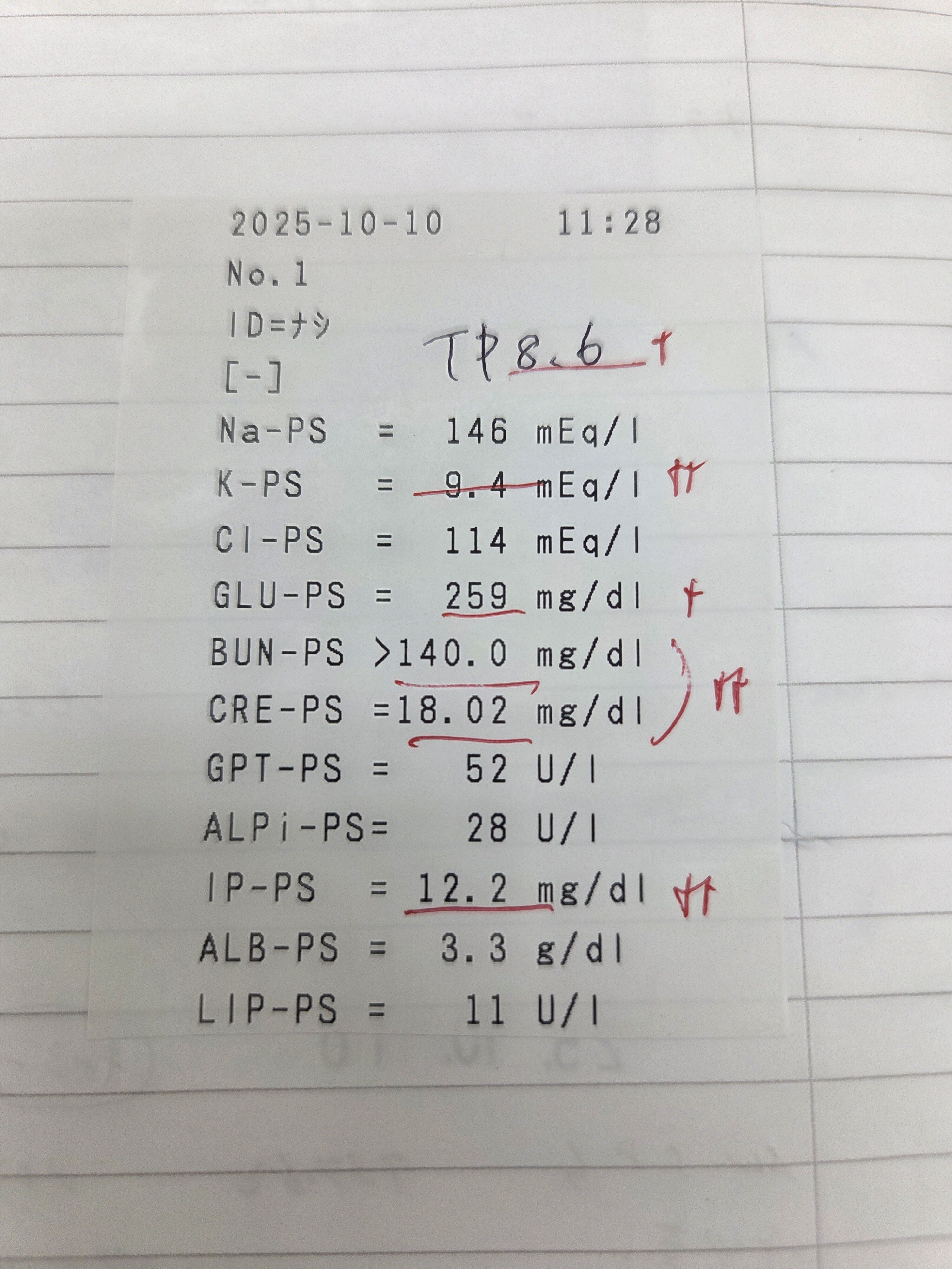 すぐに受診したところ、尿閉によっておしっこが全く出ておらず、腎機能は最悪で、更にカリウム値はいつ心停止してもおかしくない状態でした。
