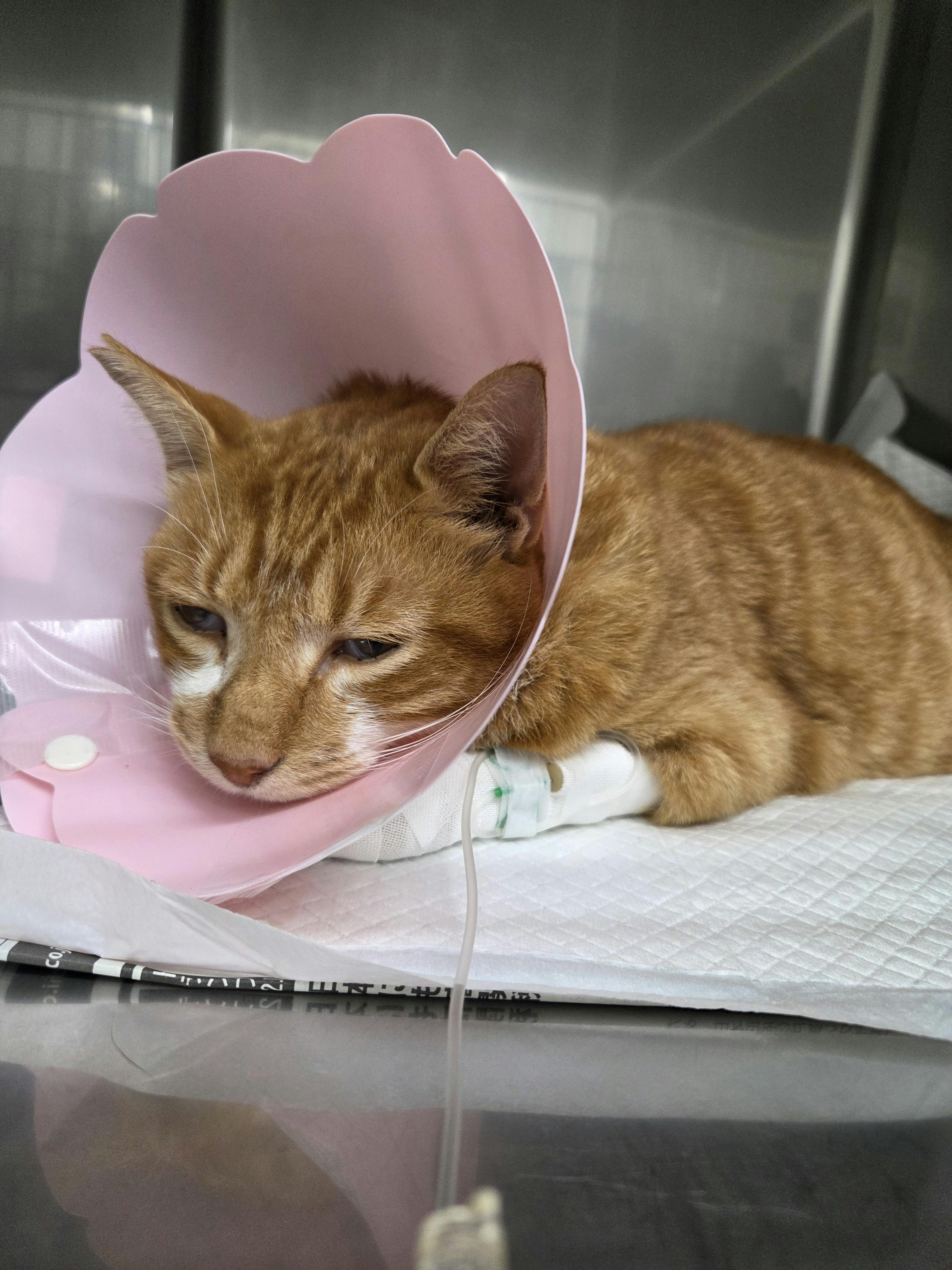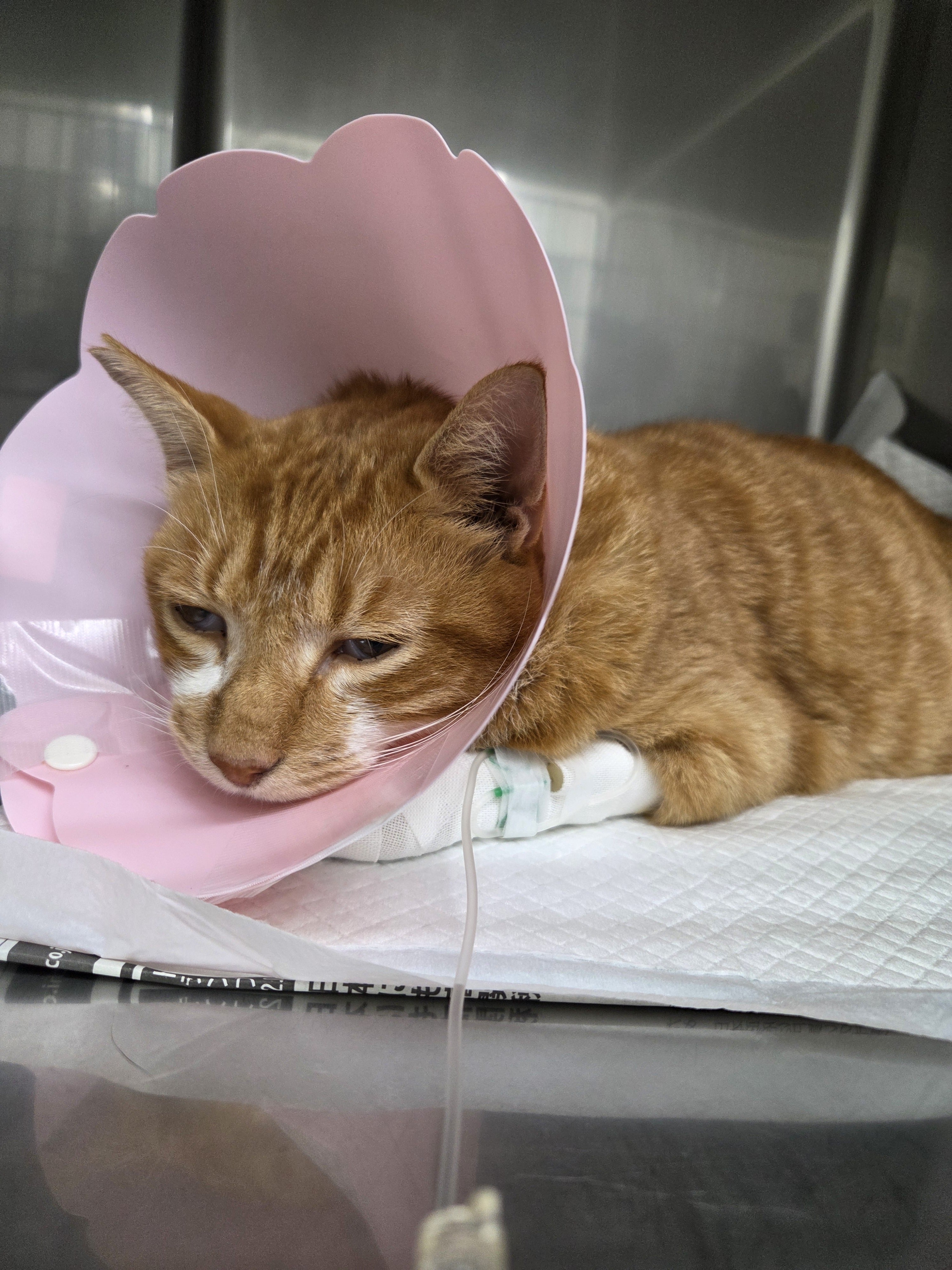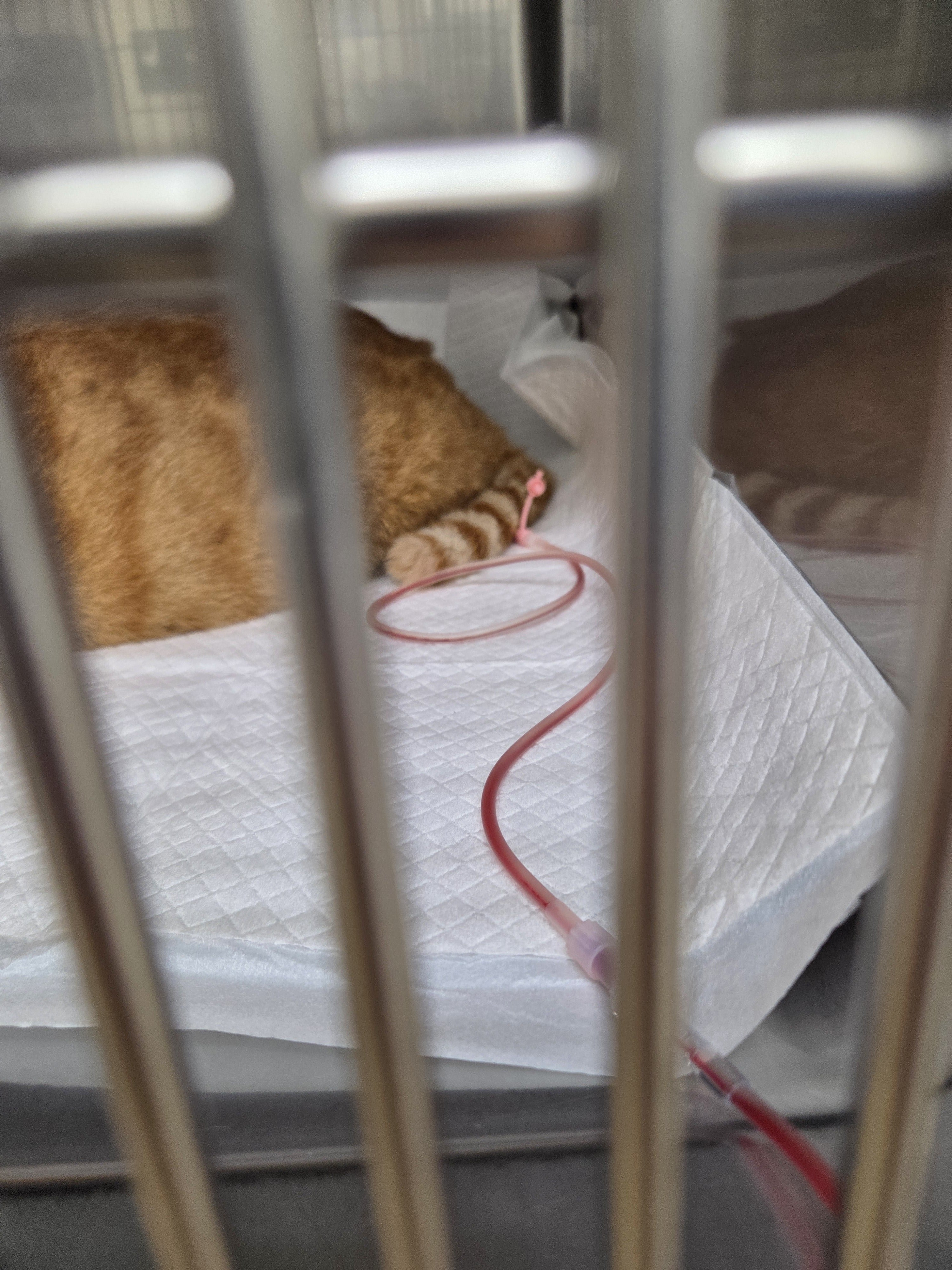 膀胱にカテーテルを入れて、出ないおしっこが出るようにしています。血尿が出続けています。声をかけてもグッタリしていて……でも、わずかに耳を動かしてくれました。