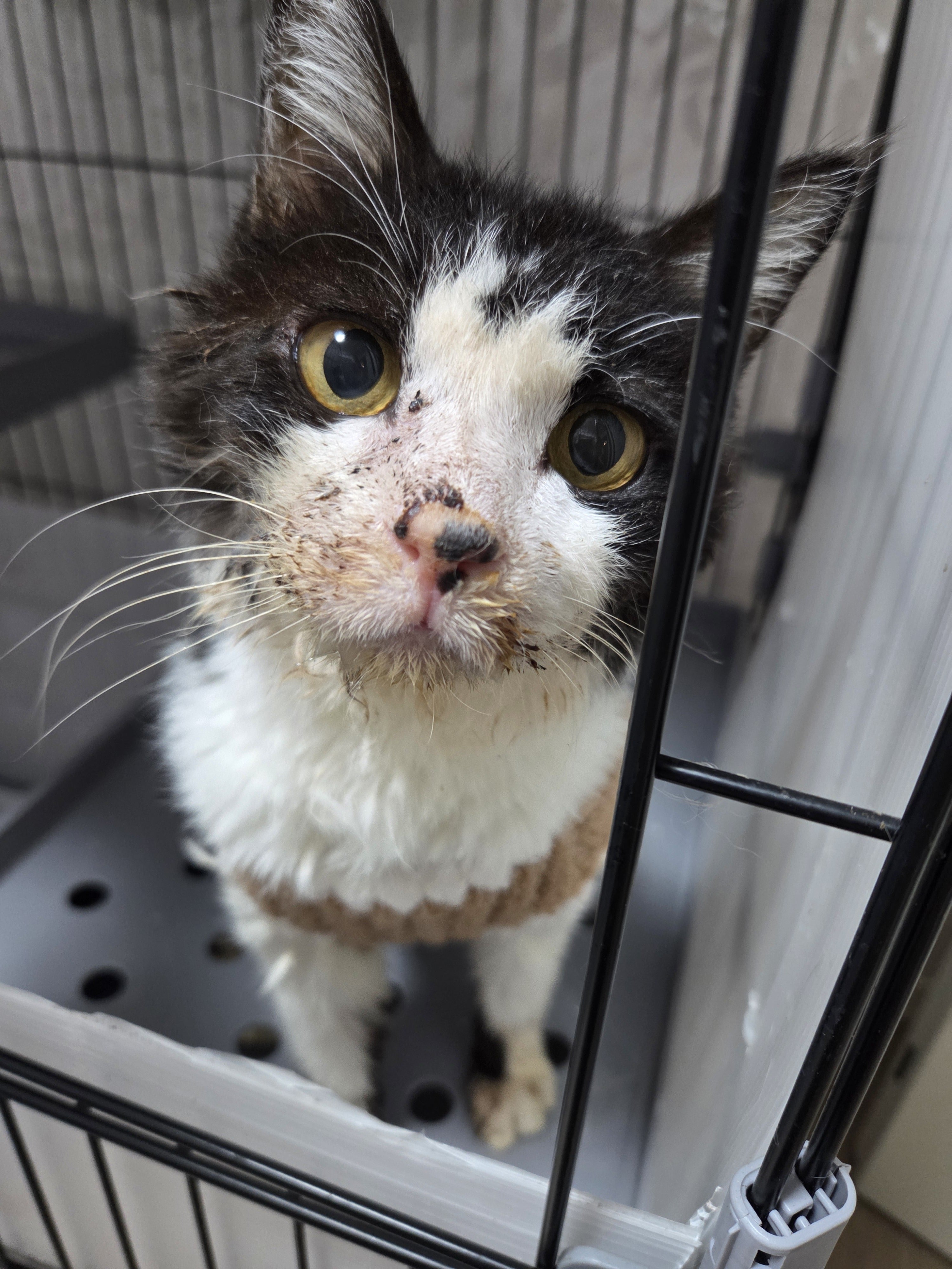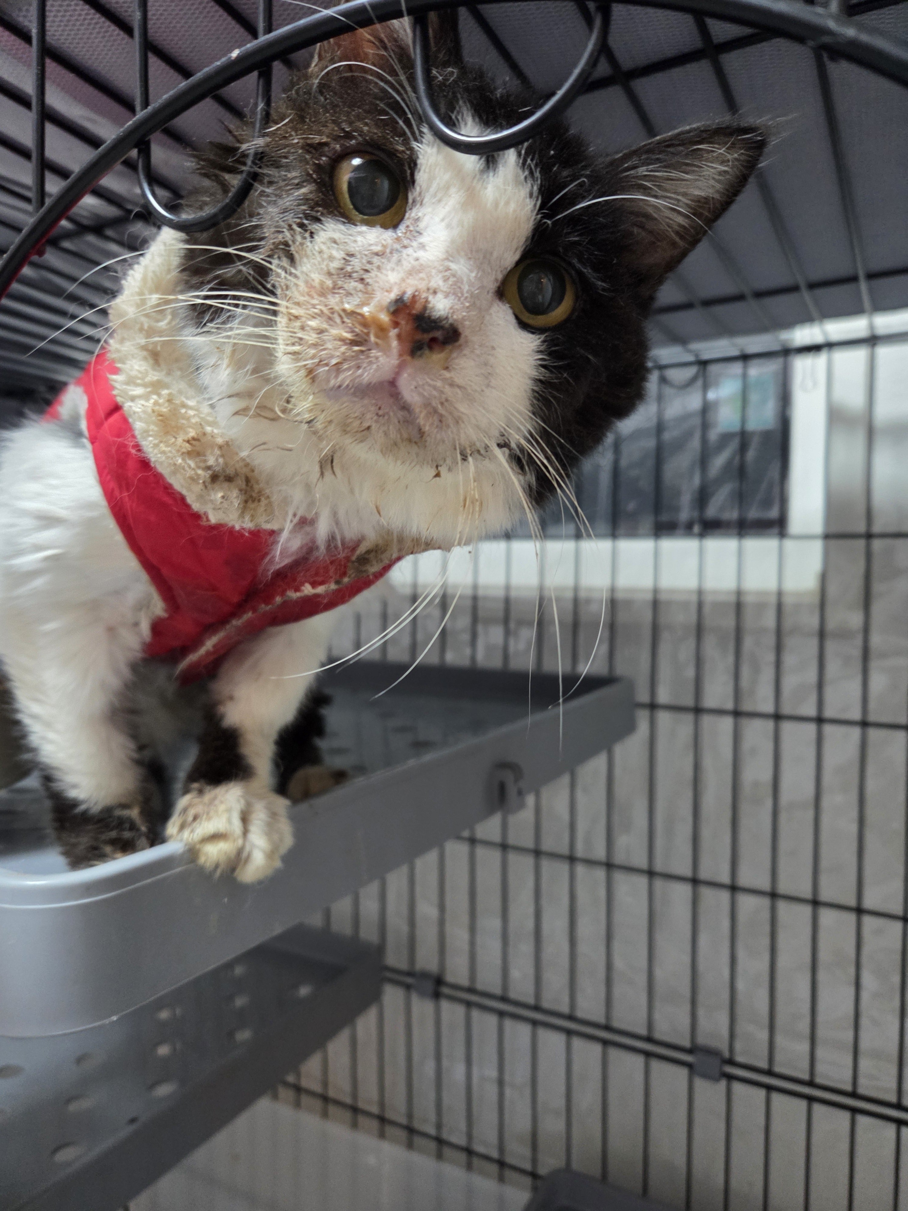全身の酷い毛玉がどうにもならず、突っ張って痛いのではないかと気になっていました。不潔にもなりやすく、皮膚炎も心配で、先日の受診時にできる範囲で毛刈りをしていただきました。嫌がって暴れると、脚のケガから出血……