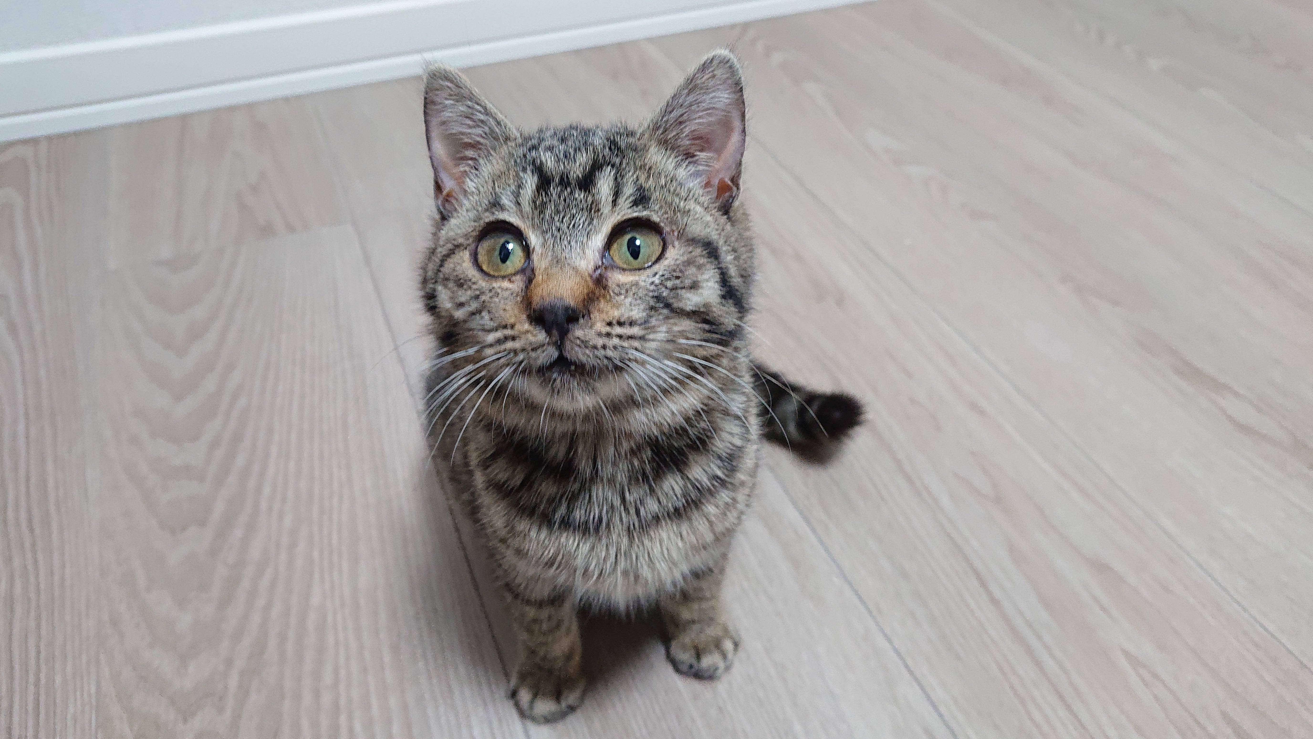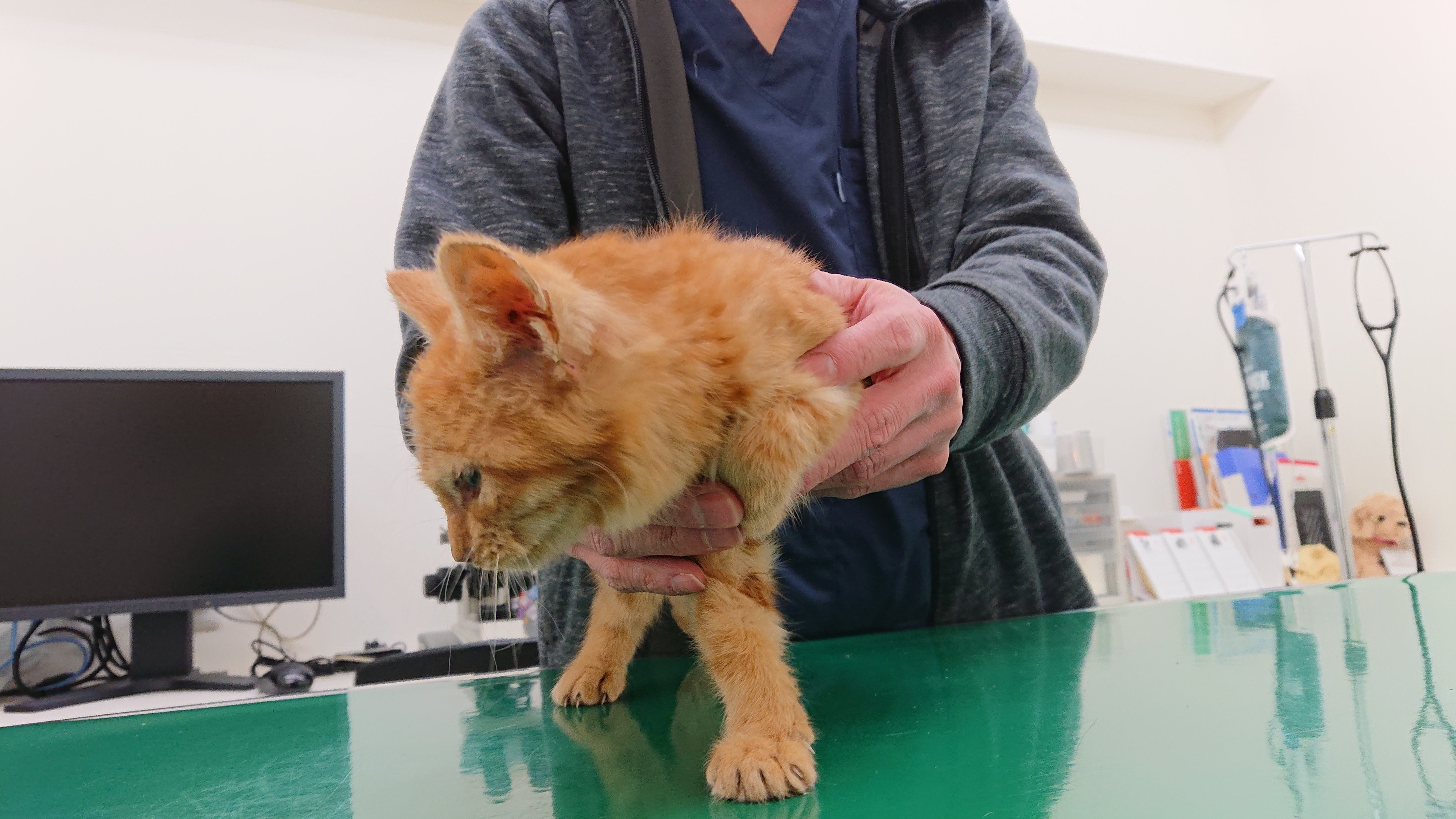 道の真ん中に子猫がうずくまっていて、轢かれそうだと友人から連絡をもらいました。あられとみーちゃんもまだ体調が万全ではないため、どうするかほんの一瞬だけ迷いましたが、轢かれてしまってからでは取り返しがつかないので、まずは保護してから考えることにしました。友人がその場に居てくれたため、その子はそこから離れることなく、幸い動けなくてうずくまっていたかんじではなさそうでした。足元にスリスリスリスリ人懐っこい、かわいい茶トラちゃんでした。見た感じ、疥癬と軽い風邪かな?少し痩せてるな?ぐらいで、元気はありましたので一安心。とりあえずキャリーに入れて連れて帰り、あられ・みーちゃんとの隔離はどうするか、預かりしてくださる先があれば……と探し、信頼できる方が引き受けてくださることになりました。病院へ行き、920gの2ヶ月半ぐらいの男の子で、疥癬と軽い風邪でした。疥癬に対しての投薬と、風邪に対しては抗生剤とインターフェロンの注射。便の検査では今のところ寄生虫は出ませんでした。今時点ではですが、エイズ白血病は陰性で、まずは一安心です。ガリガリなのにとても元気で、全く写真が撮れないほどでした。毛がフワフワで、そんなに汚れていないんです……遺棄されて時間が経っていないのでしょうか。こんな小さな子が、この寒さで生きていてくれて、車に轢かれてしまわなくて本当に良かったです。どこから来たの?絶対幸せになろうね。ーーーーーーーーーーーーーーーーみーちゃんが、いつのまにか上の段に上れるようになりました。よく食べてくれて、お肉がついた気がします。まだどちらもくしゃみはしており、みーちゃんは目やにが目立ちますが、元気に過ごしています。応援してくださる皆様に、1日も早く幸せな報告ができますように。