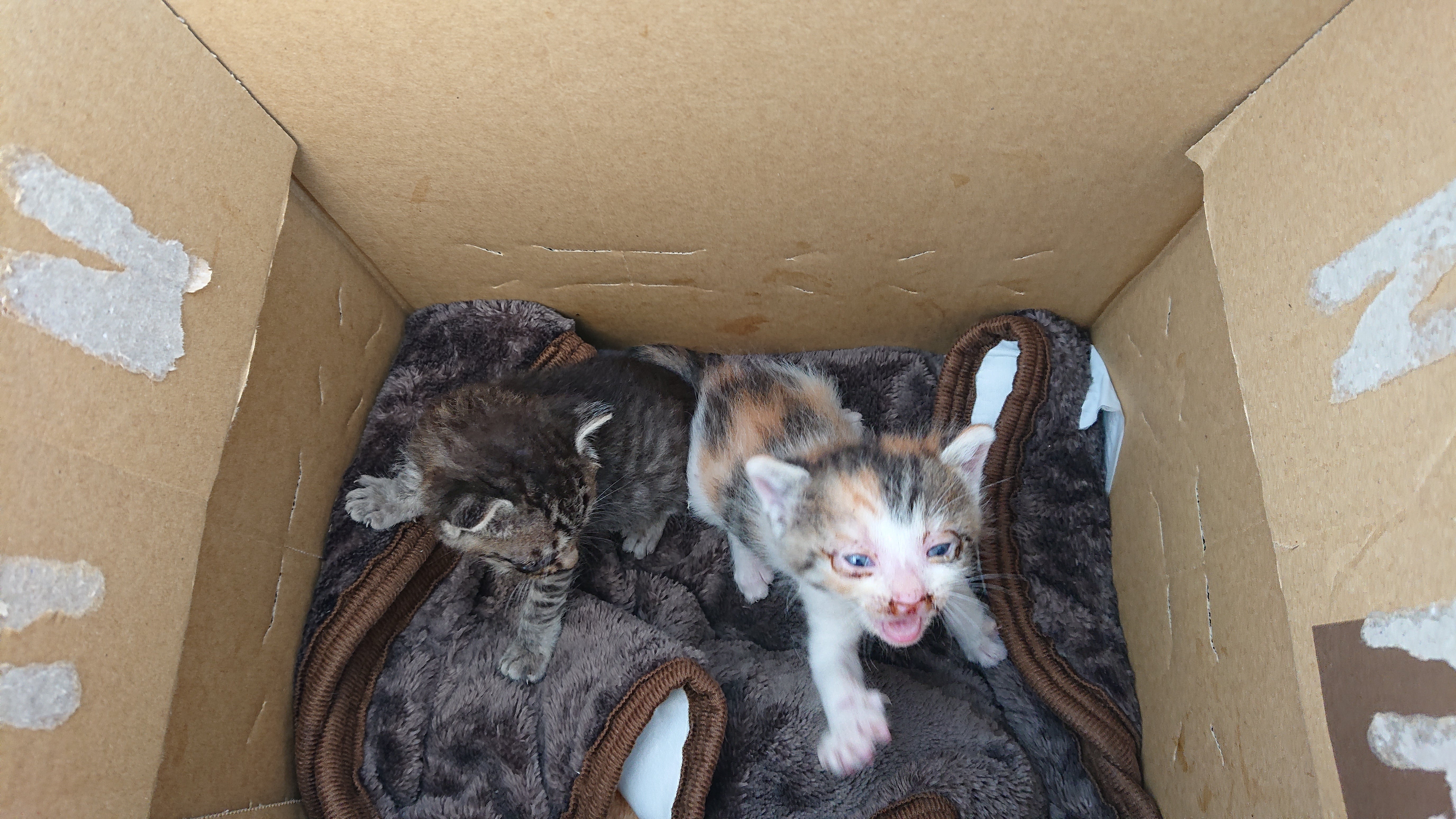 昨日保護されて、縁あって我が家にやってきました。生後14~20日ぐらいです。360gの三毛ちゃん(♀)と250gのトラちゃん(♂)。この子たちは譲渡までお世話してくれる団体さんが決まっているので、短期のお預かりです。あまり良い環境ではなかったようで、みんな風邪をひいていたり下痢がひどかったり、体調は万全ではありません。5匹兄妹のうち1匹は残念ながらお外にいる間に亡くなってしまいました。4匹はみんな揃って同じところでお世話してもらえます。ママ猫もまだ子猫から少し大人になったばかりのような若い子で、子育てがうまくいかないようですね……ママだって、まだまだ遊びたい盛りのはずです。それなのに過酷なお外で出産して必死に子育てしていました。避妊手術をする予定とのことで、今回の出産が最後になることを願います。仔猫たちはというと、全身ノミだらけで、風邪もひいています。夜中も2~3時間毎にミルクをあげましたが、ミルク嫌々でなかなかうまくいかず……。お手てもなんとなくカビっぽい気がして、今朝受診してきました。風邪に対して点眼と抗生物質を貰い、軽度の脱水があったため皮下補液をしてもらいました。お手てはやっぱりカビ(真菌)でした。歯が生え始めているので、ミルクと混ぜてムースをあげていってみようと思います。せっかく保護してもらった命です。幸せに生きるために生まれてきた命です。この子たちの猫生が幸せに満ち溢れた輝くものになりますように。