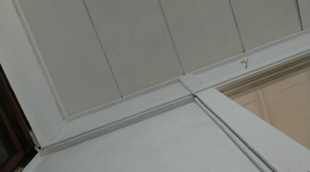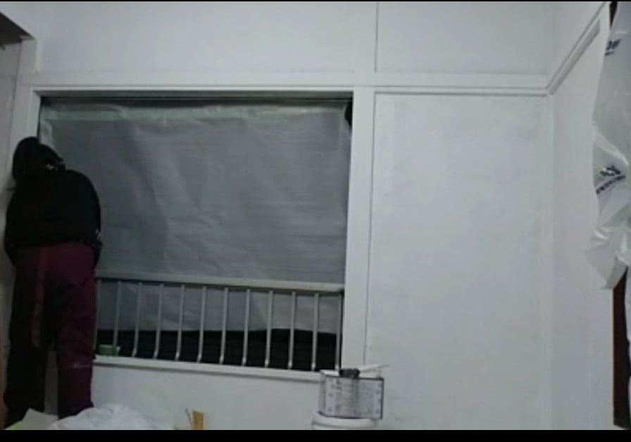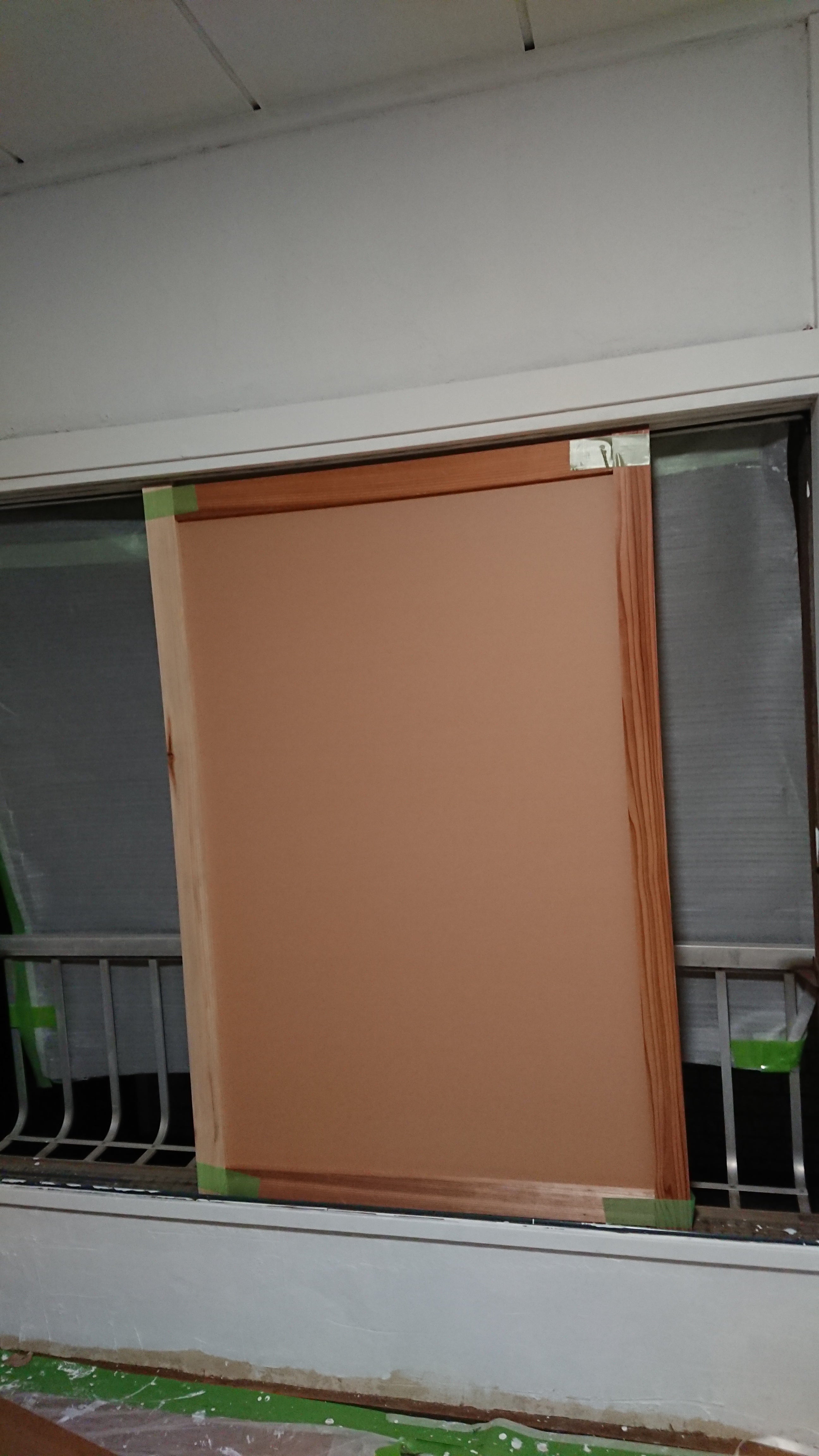これまだ仮止めですが、木枠は白ペイントして、撥水スプレーをしてガラスのフィルムはがしてはめて格子のサンを後付けします。