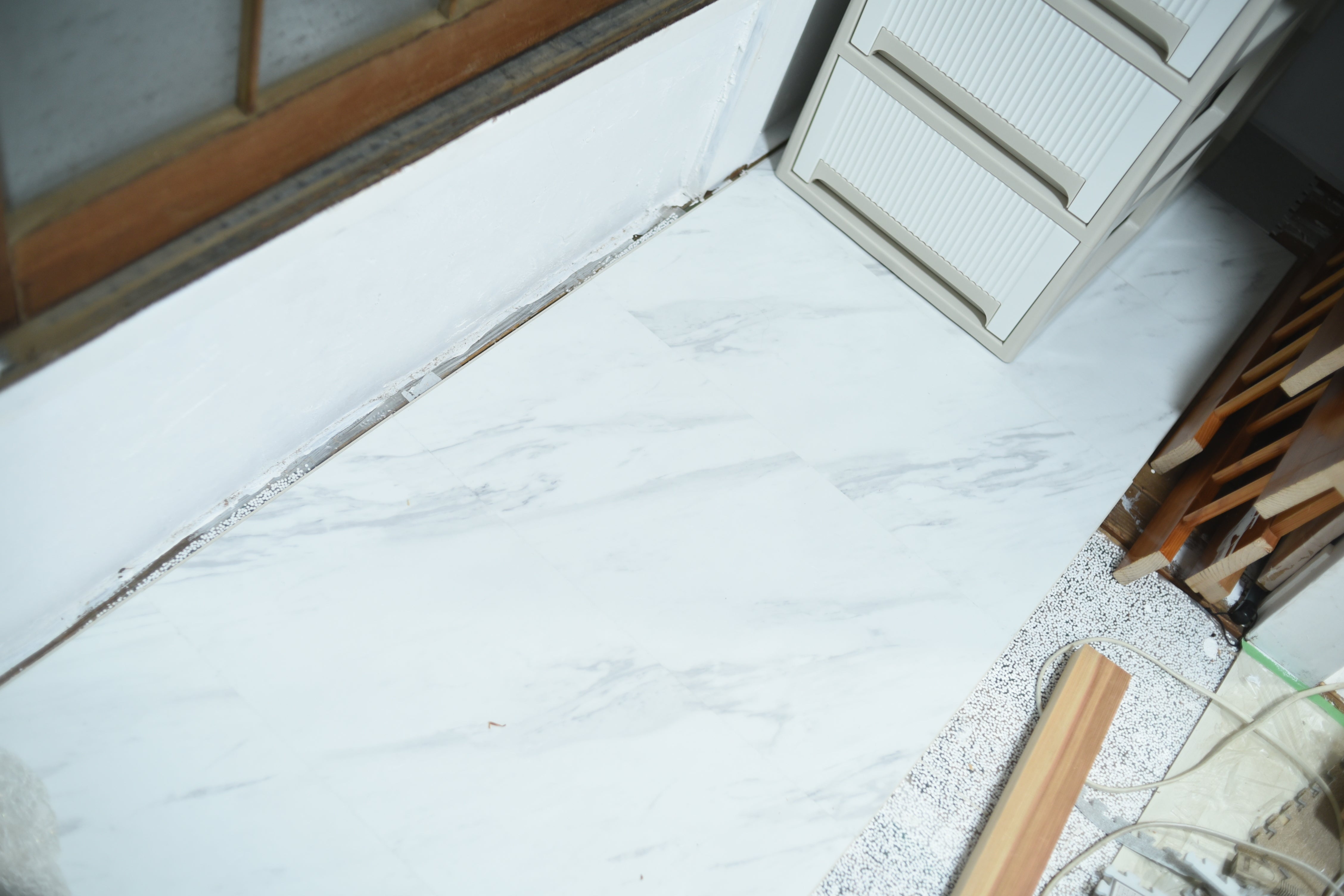 ベランダ前に大理石風の何か敷き詰めました。あと少し空いている空間はパネルフロアを切り取っ埋めます。