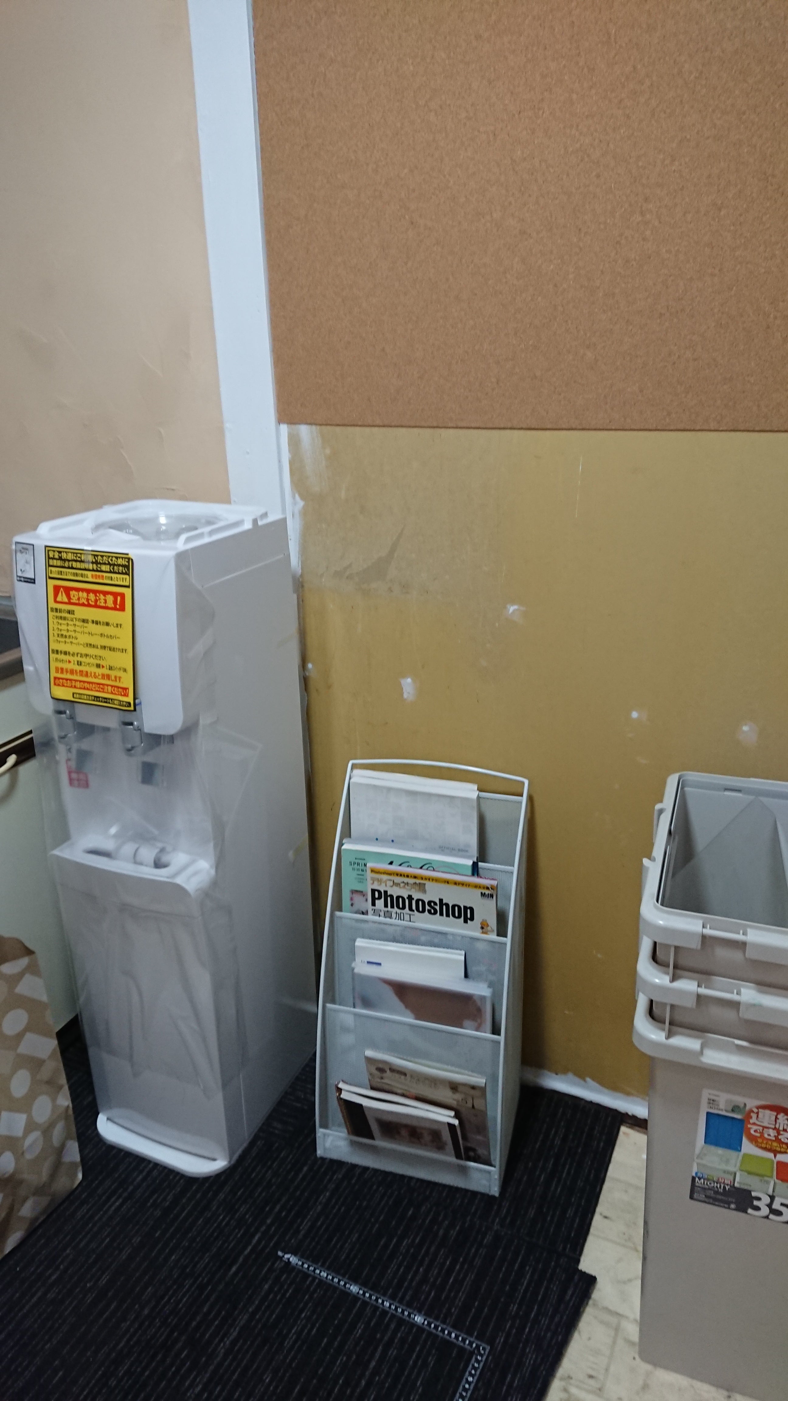 ウォーターサーバー設置しました!この横に写真やドール、イラスト関係の雑誌類がおいていますがこれは後日移動します。ここにはロッカー棚兼カウンターテーブルを設置予定です。