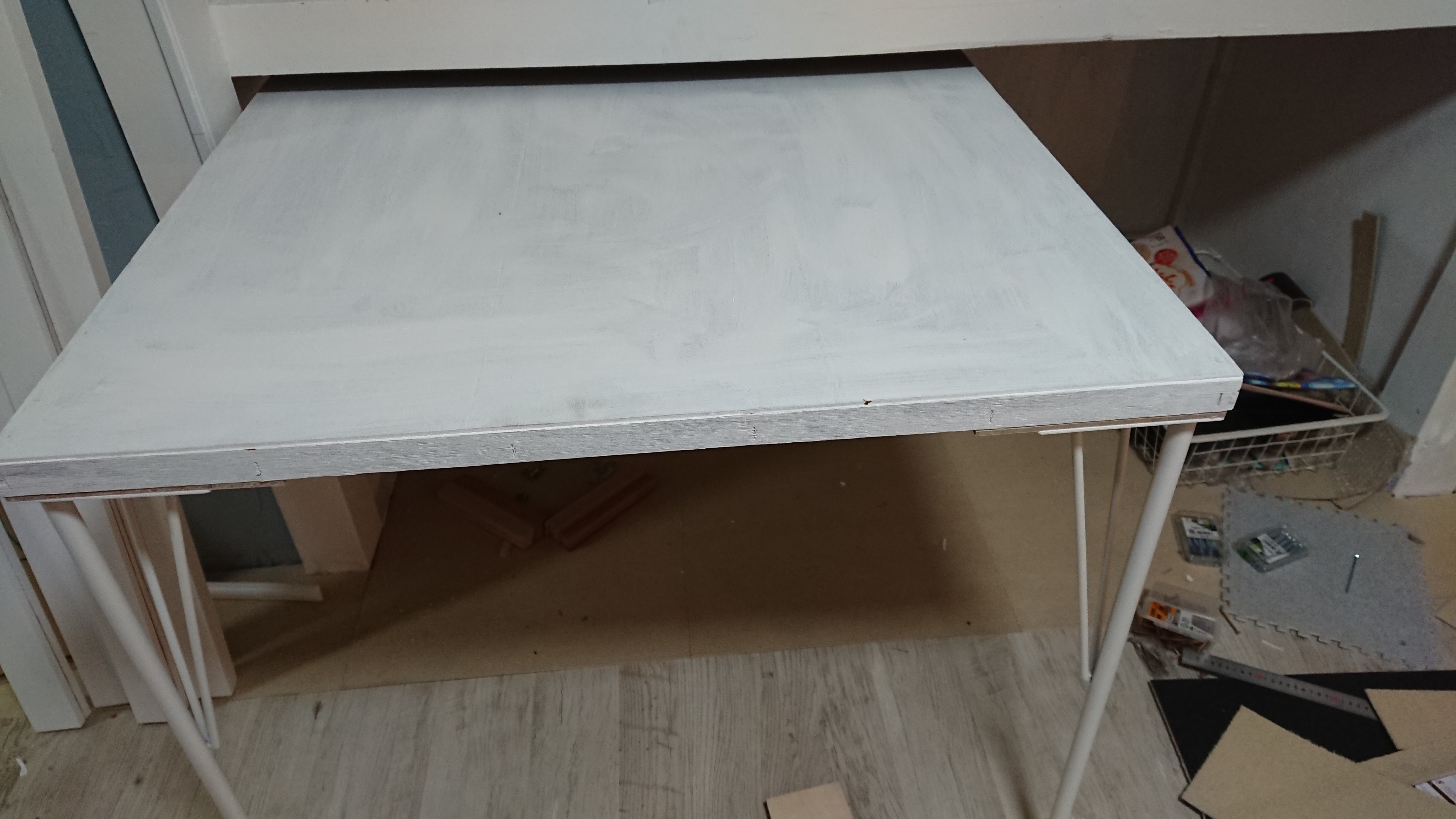 この机、現品限り角割れで売られていたものを接着して、天板にワックス、脚にアイアン塗装をおこないました。