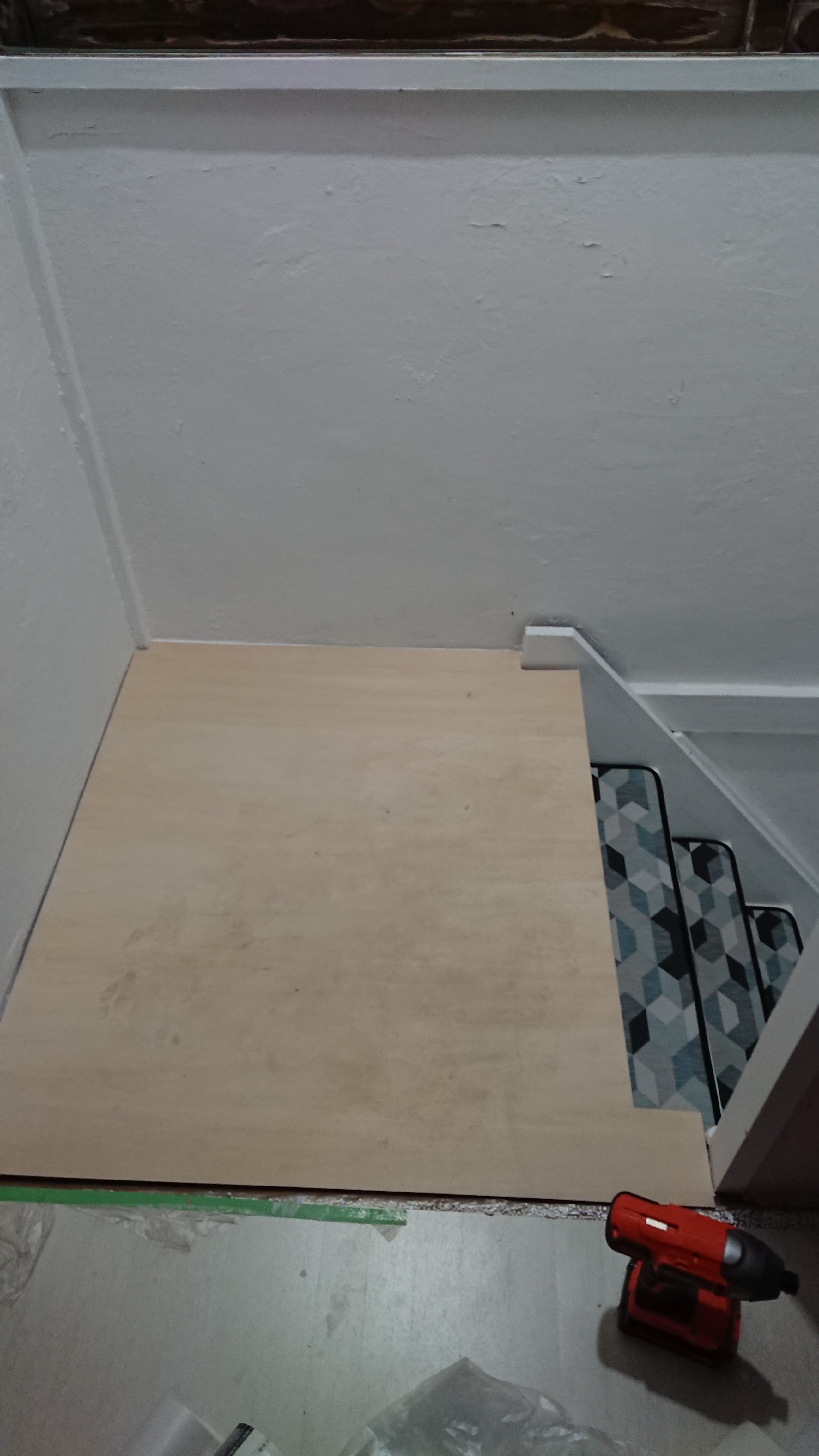 ようやく階段です。最上段部分と部屋の入口に大きな段差があったので根太を敷いて合板設置。夜遅くなったのでタッカーを後日打ち込んで隣の部屋と同じカーペットを敷きます。