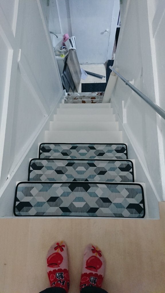 私の計算ミスでクッションが足りず下の3段まだやってませんが、クッション敷きと階段マット敷きほぼ完了です(階段マットはまだ仮置き)