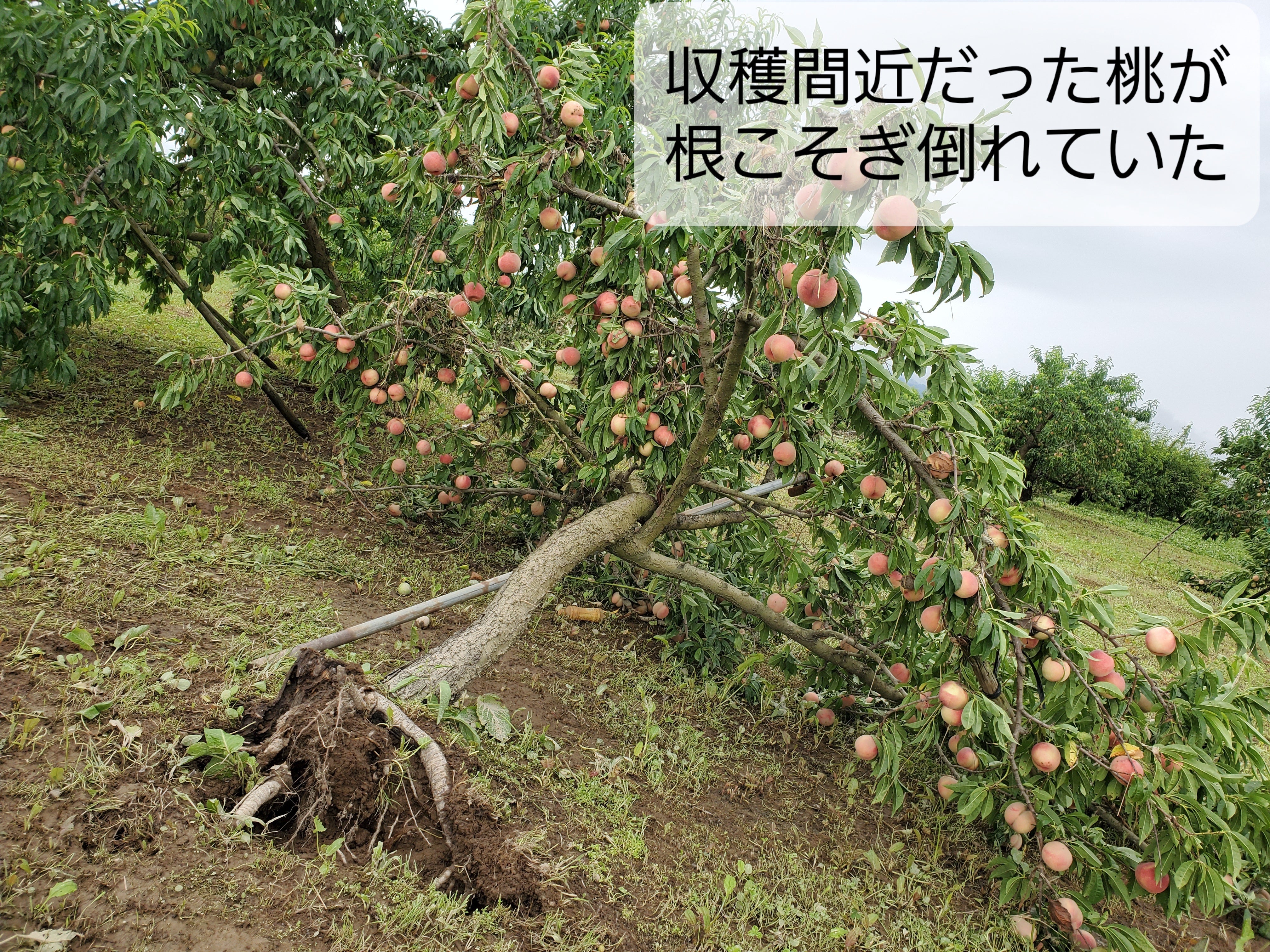 収穫間近だった桃の木が根こそぎ倒れ