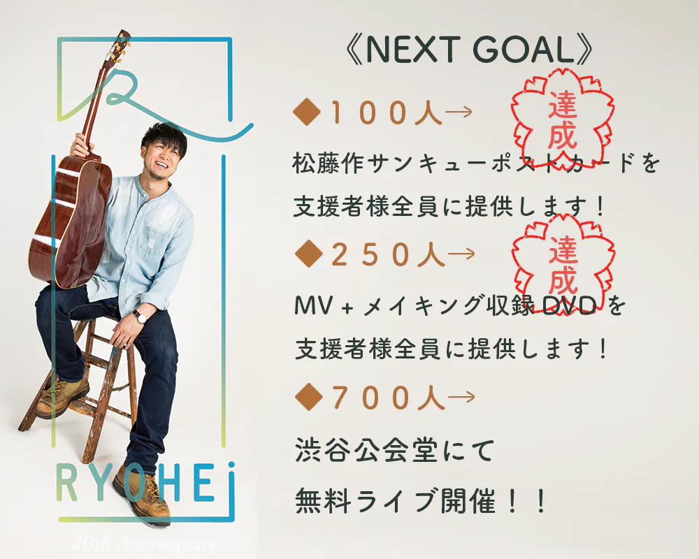 100人達成の松藤作のサンキューポストカードに加えて、MV全てとメイキングを収録したDVDを支援者様全員に提供致します!一重に皆様のおかげです。ありがとうございます。