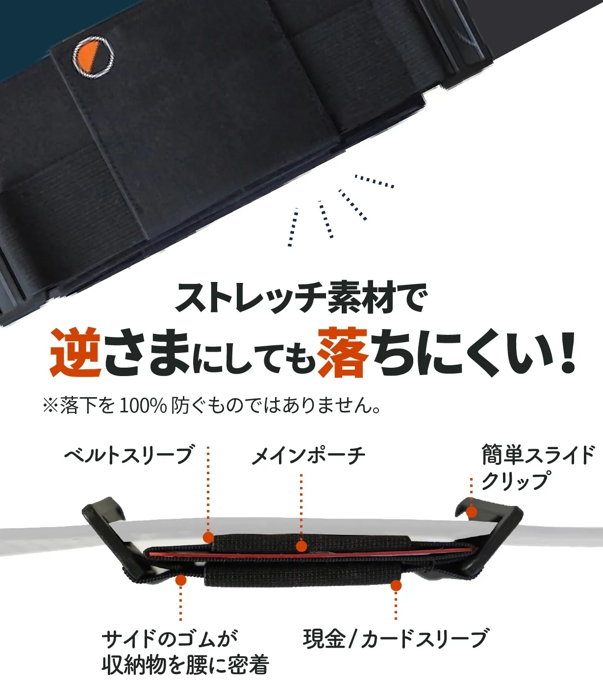 「中の物が落ちないか?」ご心配の方の声も聞きますがサイドの伸縮する素材が腰に密着し「前後左右」全ての方向から力が働くので、口を下にしても中のカードや現金が落ちる心配はなく、安心して貴重品を持ち歩く事が可能です。