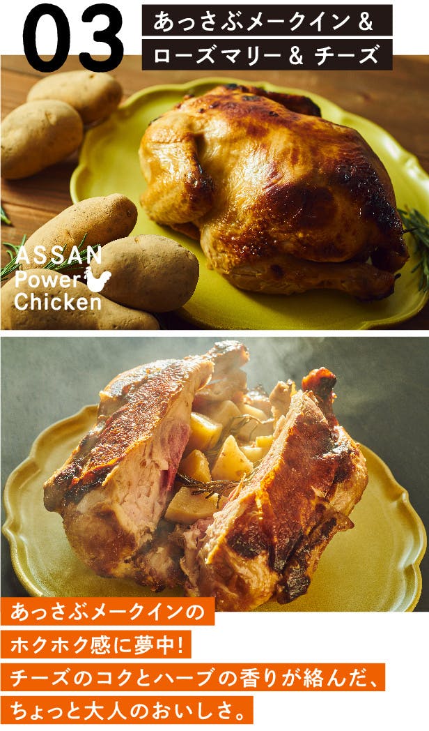 日本国内でも広く知られてきているロティサリーチキンですが、チキンの味付けは淡白なものがほとんどです。そこで『ASSAN Power Chicken』はチキン自体からジュワッと溢れ出る濃厚なおいしさを探求。“秘伝のタレ”にじっくり漬け込み、旨味を熟成しました。強さのある味に仕上げているから、具材にした個性の強い野菜との調和が絶妙なのです。