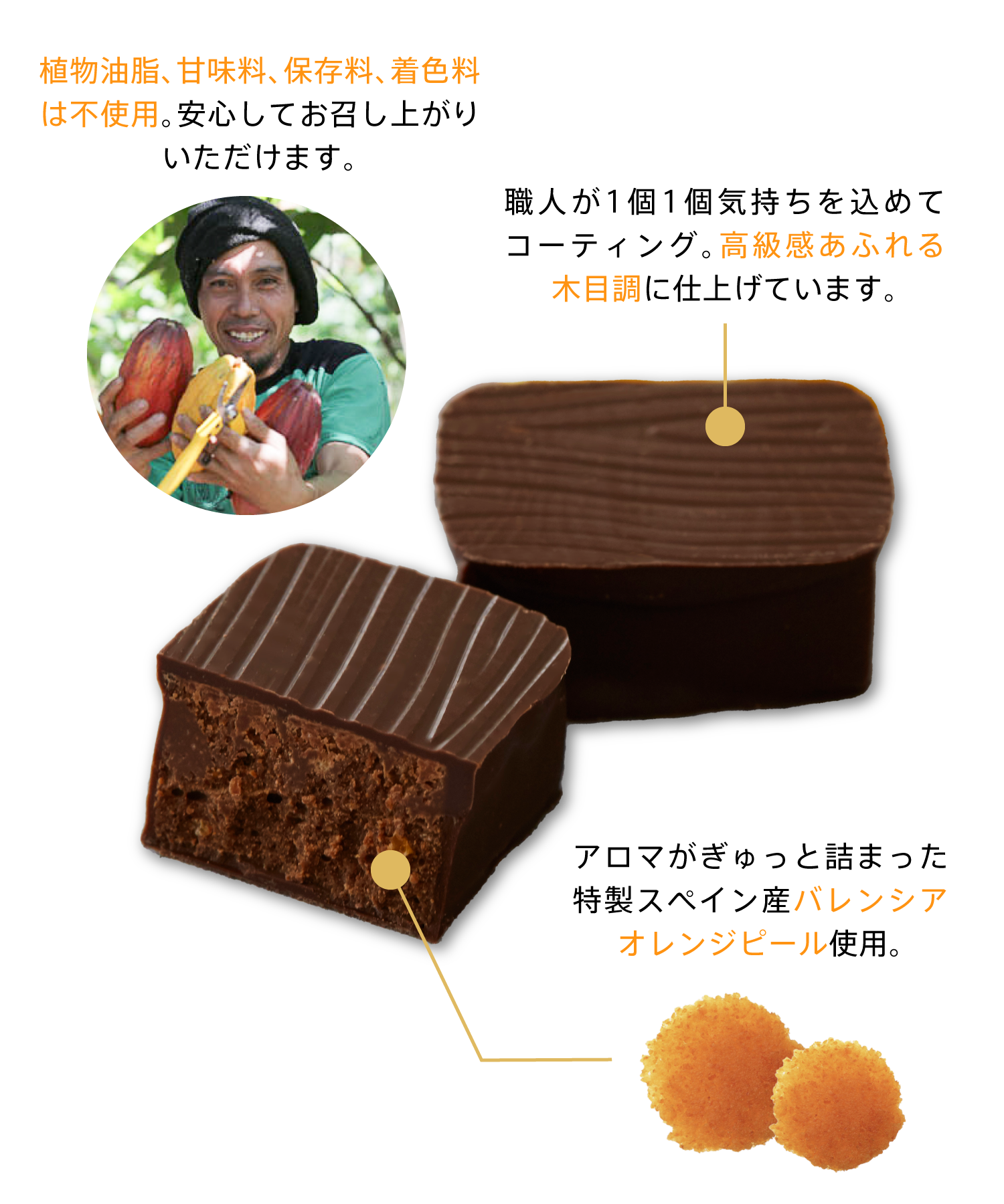 オレンジの爽やかさとキレを最大限引き出すために、アロマがぎゅっと詰まった特製スペイン産バレンシアオレンジピールを使ってプラリネチョコレートに仕立てました。