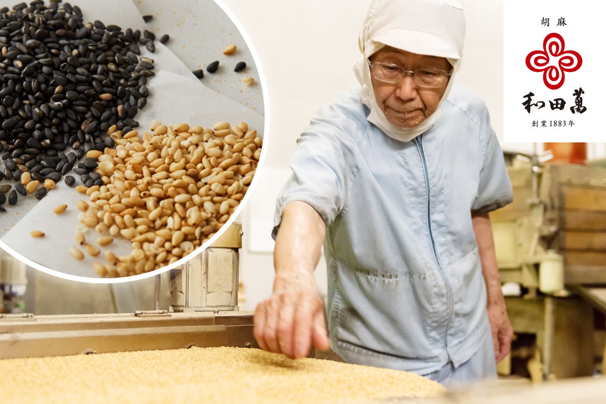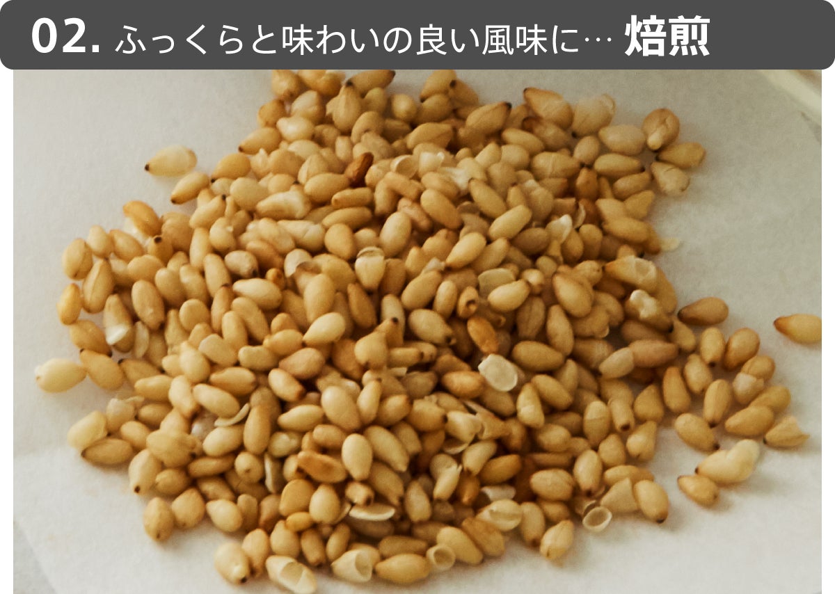 水をふくませたごまを少量ずつ丁寧に焙煎することで、皮を焦がさず、じっくり中まで熱を通し、ふっくらと味わいの良い、透明感のある香ばしい風味に仕上がります。
