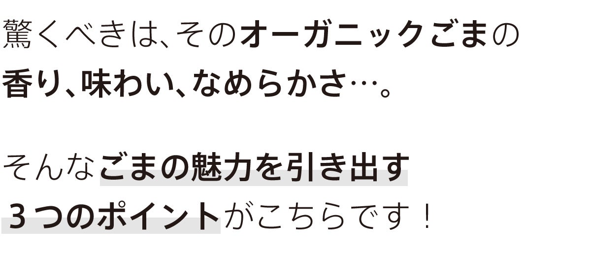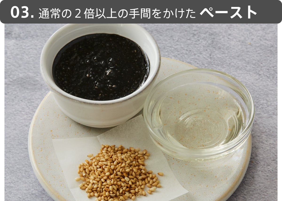 ごまをペーストするのに、石臼を使って挽く方式を採用しているのですが、一般的なごまペーストに比べて2倍以上、丁寧に丁寧に挽いていて、至福のなめらかさを実現。普段はごまの硬い殻に守られていて摂りづらい栄養素の吸収率も良くなるので、いいことづくめ。
