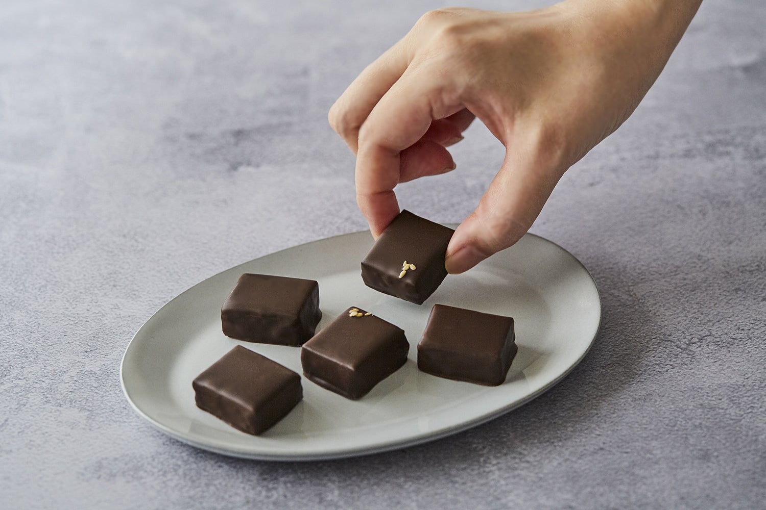 「ひとくち -HITOKUCHI- 」では、“毎日食べたくなる味わい”を追求し、製造が難しいビターチョコレートを使ったプラリネを開発いたしました。