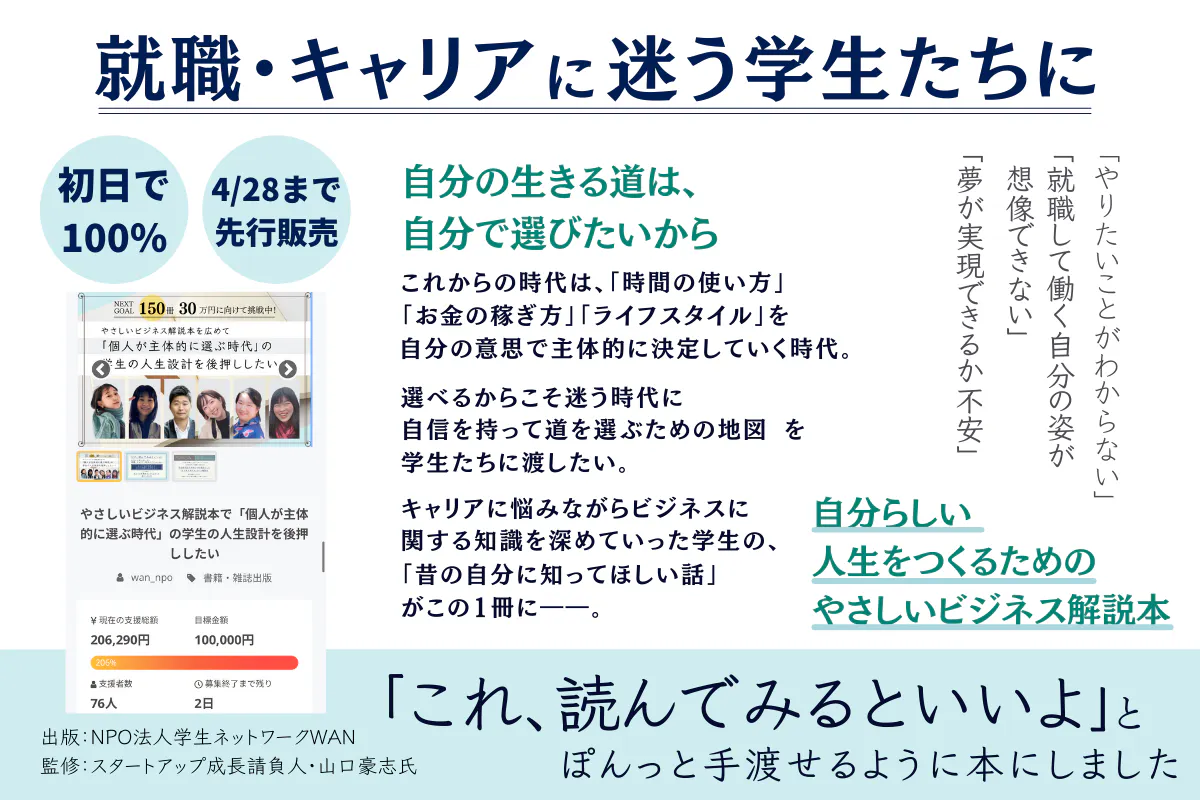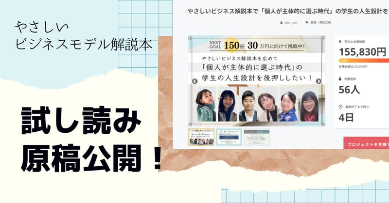 この書籍は学生やいままでビジネスの知識に触れてこなかった人々に、「自分の人生を作っていく上で必要な知識」としてビジネスの知識に親しんでしもらうことを目指して執筆をすすめる書籍です。「専門知識」や「特別な知識」としてでなく、誰の生活にも関係のあることであり、「起業」や「経営」をするわけではなくても、1人1人が働く上で持っておきたい土台になる知識であるということを、今回公開するこの試し読み原稿から感じ取っていただければ幸いです。