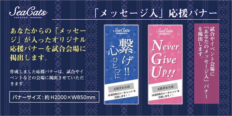 試合会場やイベント会場でメッセージとお名前が入ったバナーを掲出させていただきます。あなたの言葉でシーキャッツを応援してください!