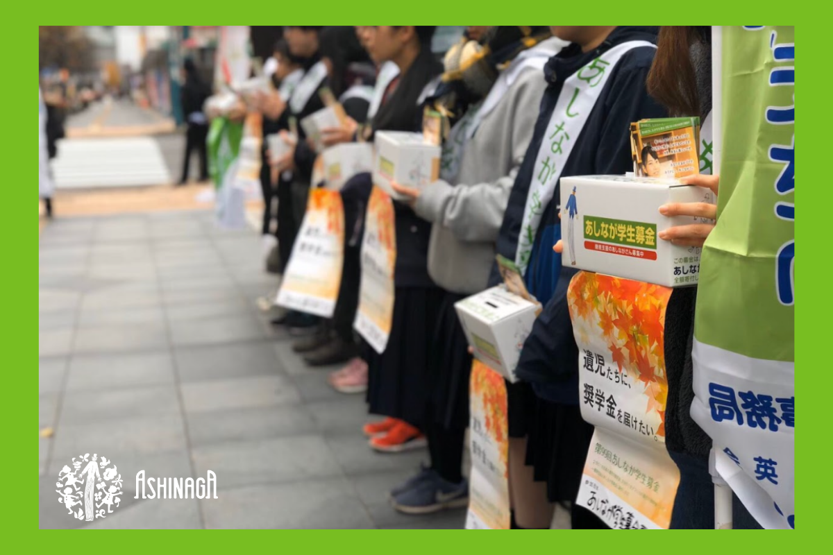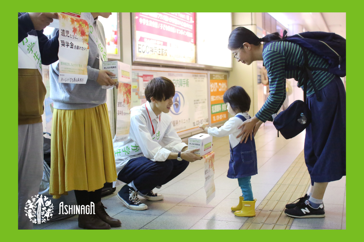 あしなが学生募金は毎年、春と秋に全国約200ヶ所で街頭募金活動を行っています。いただいたご寄付は全額を「あしなが育英会」に寄付し、病気・自死・災害によって親を亡くした子どもたちや、親に障がいがある子どもたちの奨学金、また、サブサハラ・アフリカの遺児たちが高等教育をうけるための奨学金として使わせていただきます。