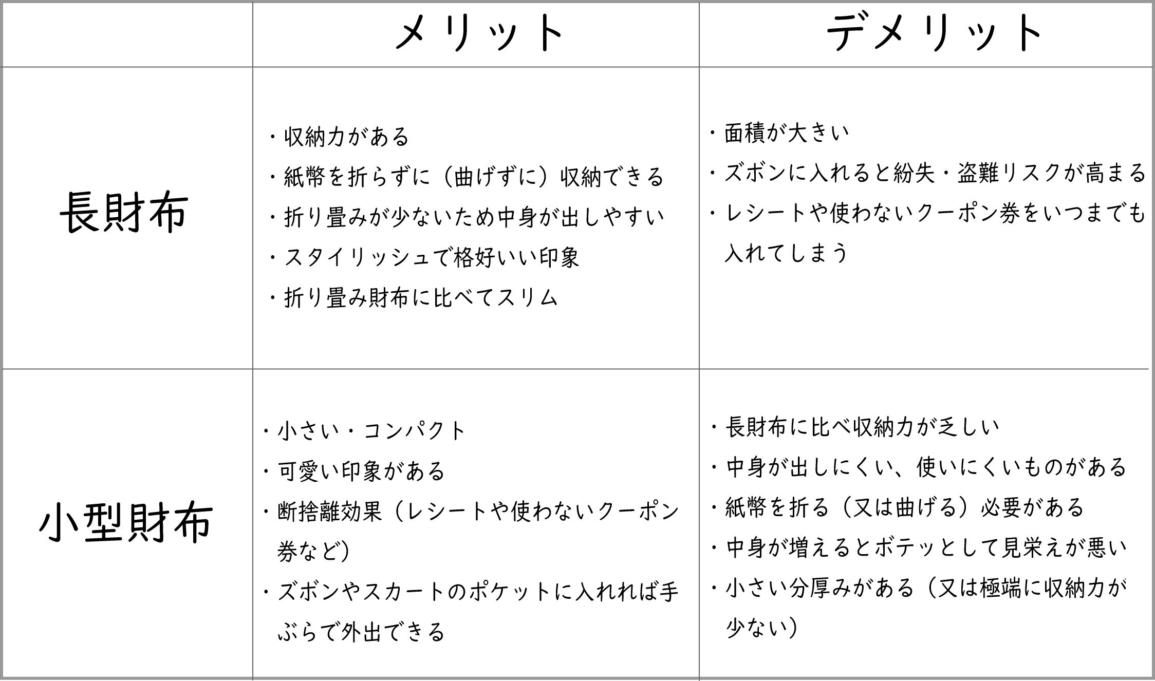 まず最初に、一般的な長財布と小型財布の「メリット」「デメリット」を私なりに挙げる事から始めました。