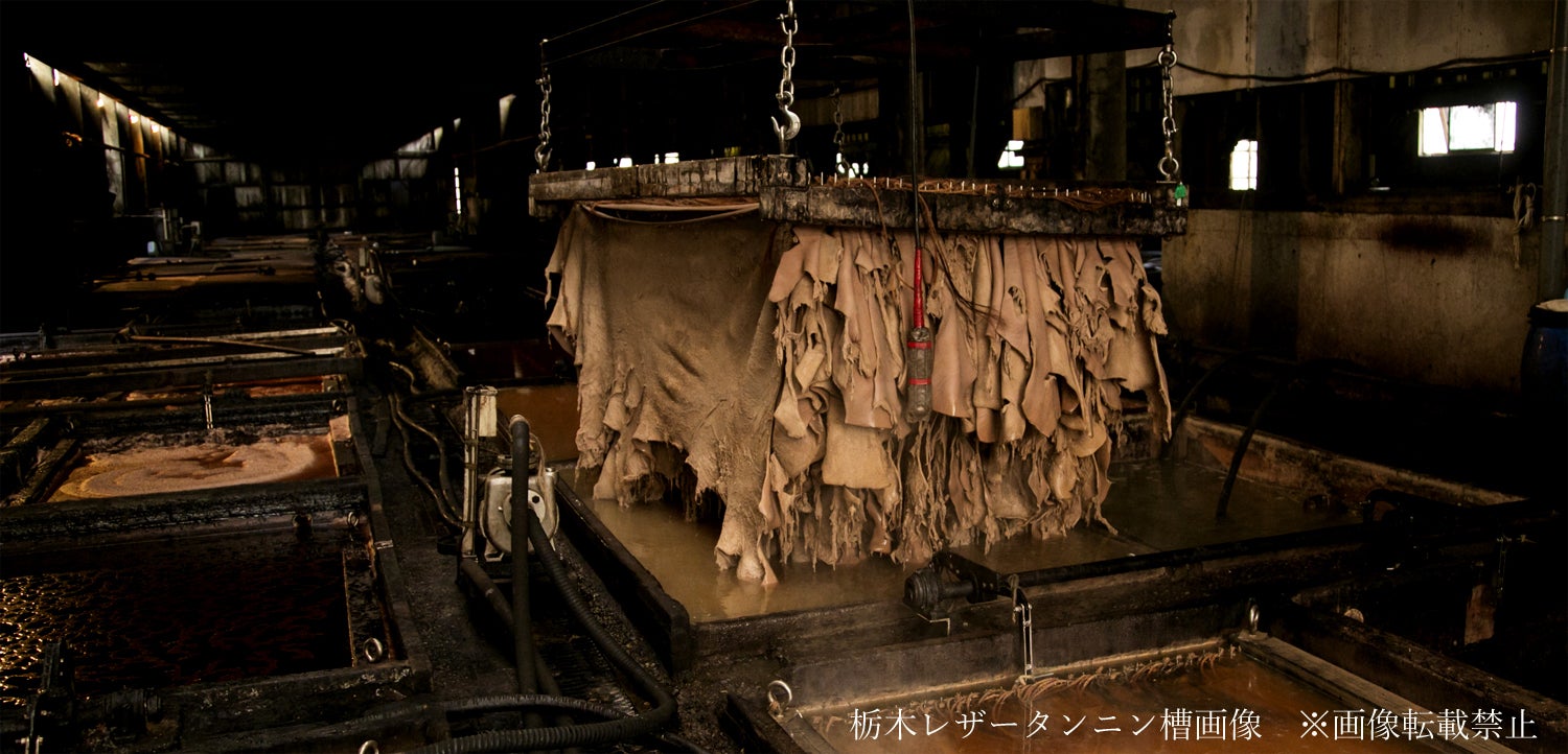 栃木レザーは「皮」から「革」へと改質するための鞣し工程に、有害な化学薬品を一切使わず、自然由来の成分のみで鞣します(植物性タンニン鞣し)。