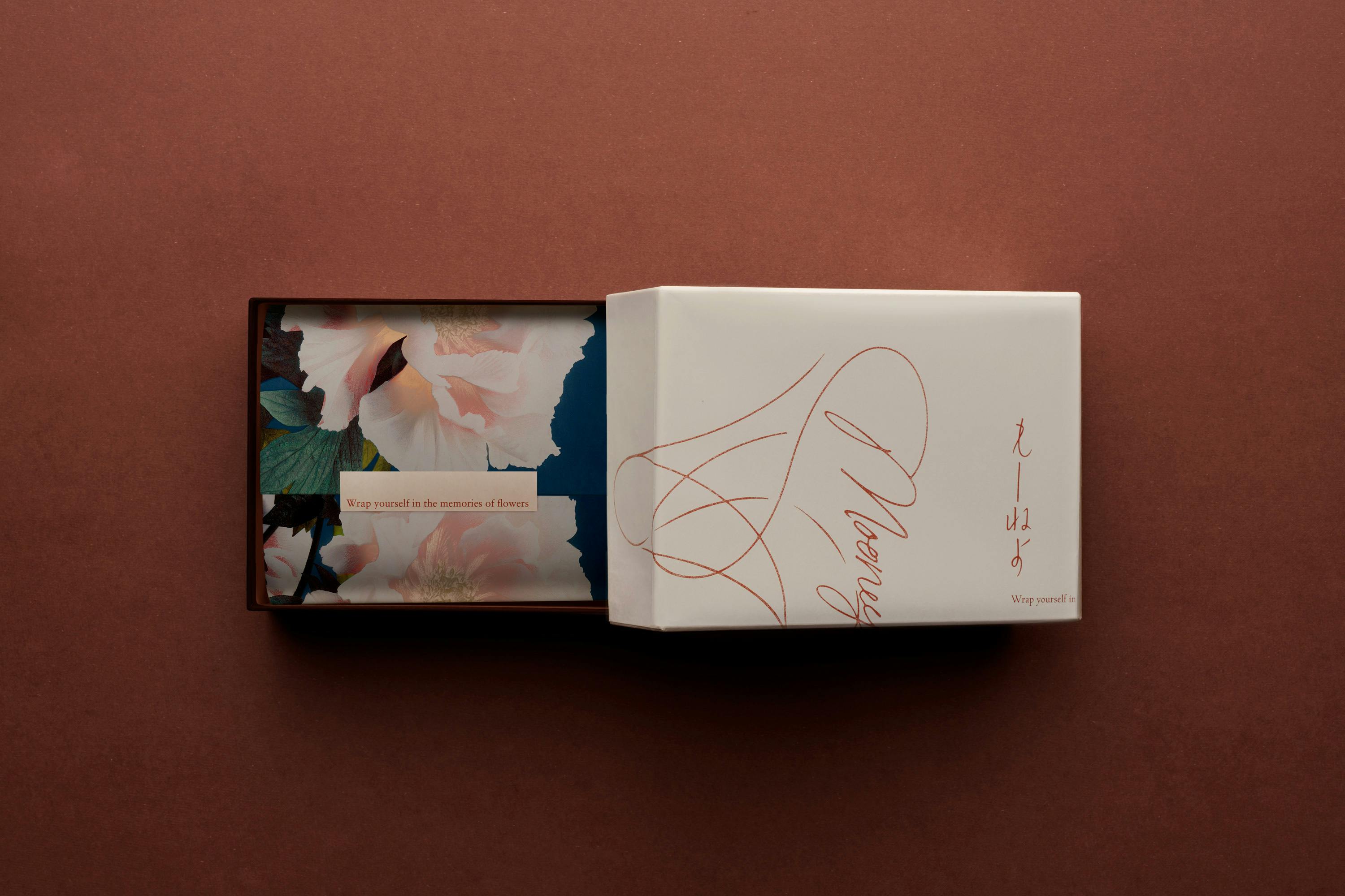 ブランドカラーである「テラコッタ」をあしらった箱には、“Wrap yourself in the memories of flowers”という、ブランドメッセージが箱を包み込むようなかたちで刻まれています。また商品を包む薄紙には、明治から大正にかけ日本の写真界の黎明期を担った小川一真の写真を用いています。