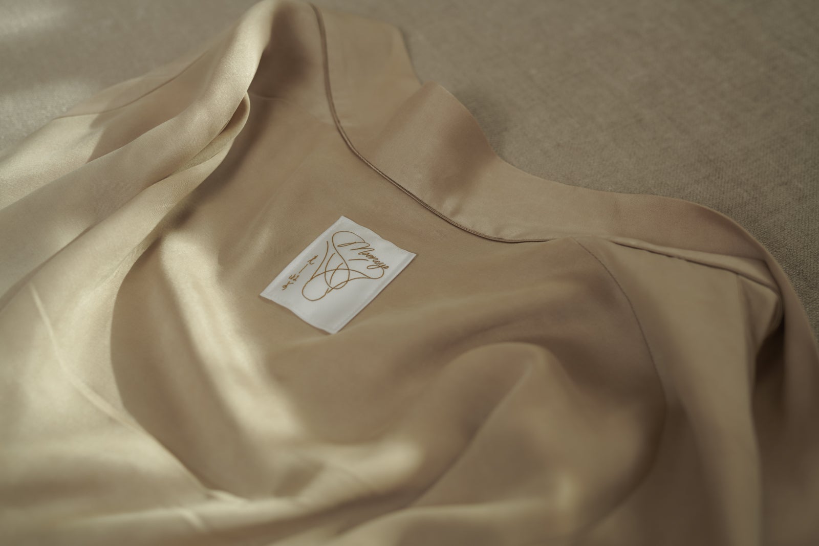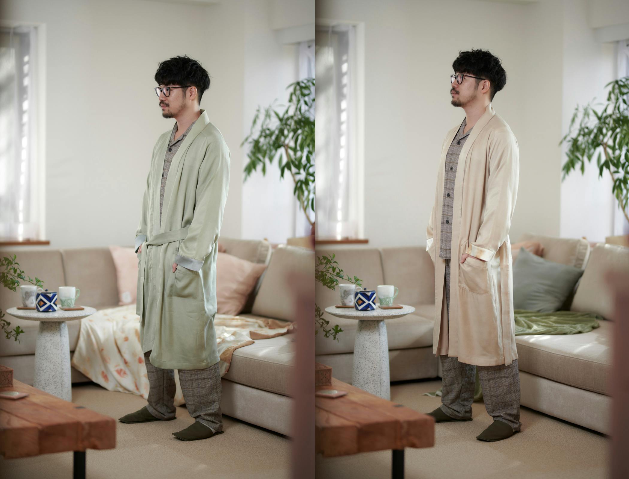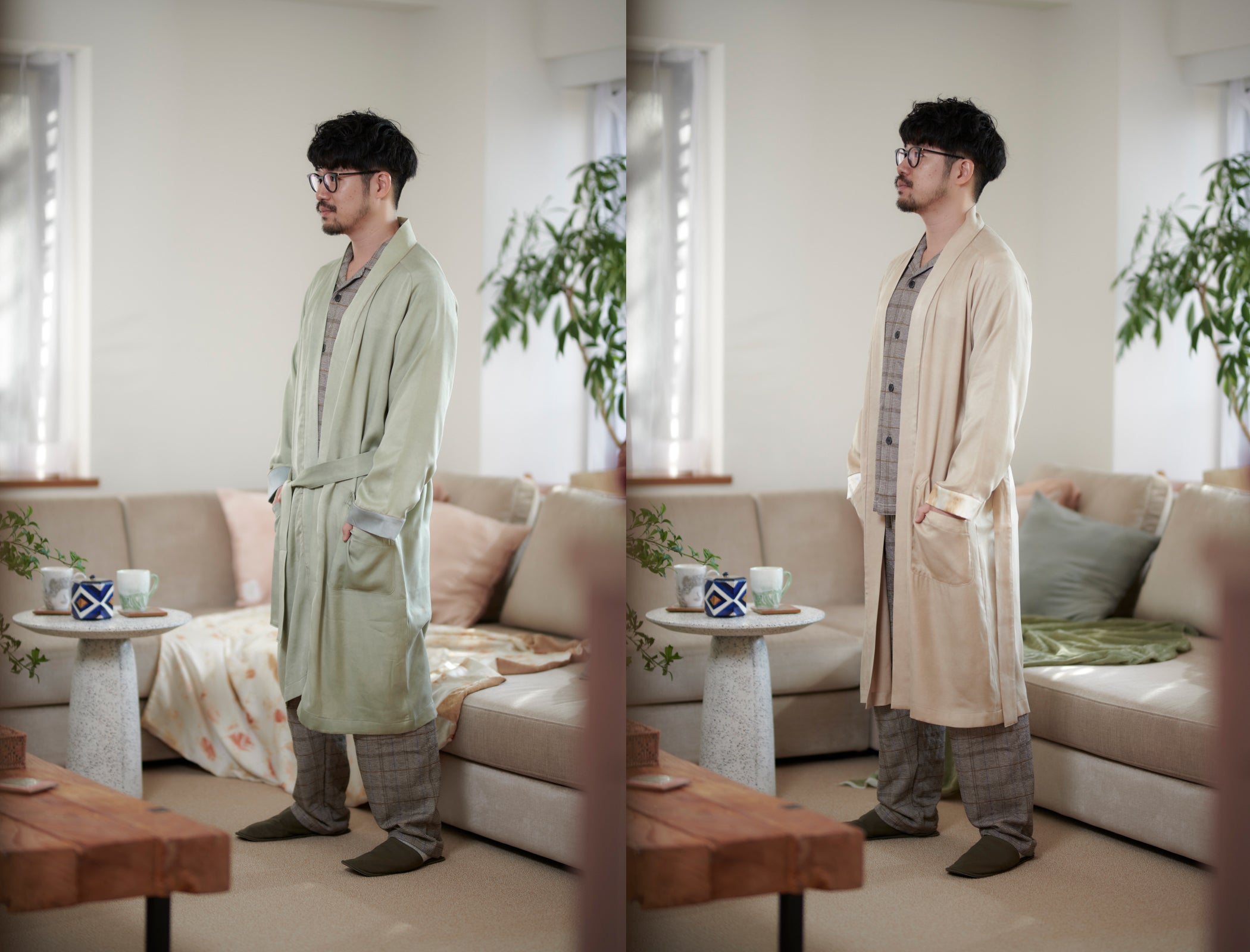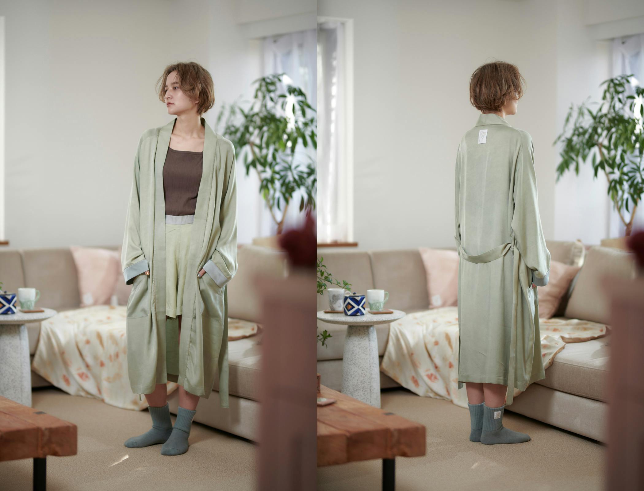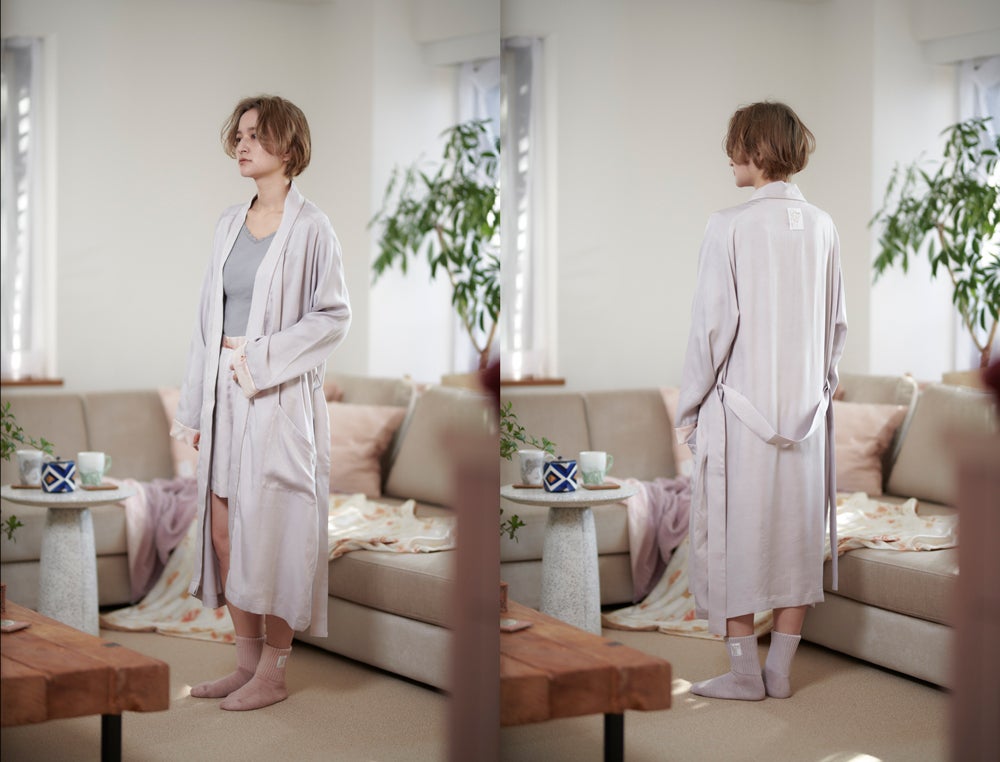 お部屋でのリラックスタイムや、近所のお散歩などちょっとした移動の際にご利用いただきたい、上品なガウン。襟元や袖口部分に施したコードパイピングが、より上品に仕立て上げています。京都と東京の職人さんが一枚一枚の生地を手作業で、草木染め・花びら染めの技術を使って染め上げています。より花を身近に感じるため、袖部分は国産シルクの上に花びら染めを施しています。花に包まれた気持ちになる極上のラグジュアリー時間をお楽しみください。