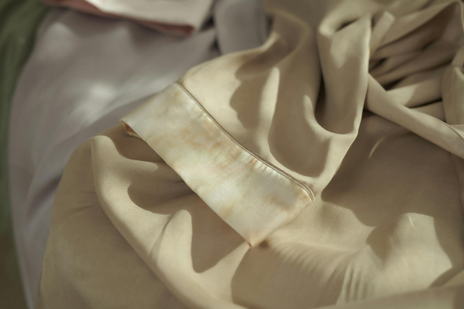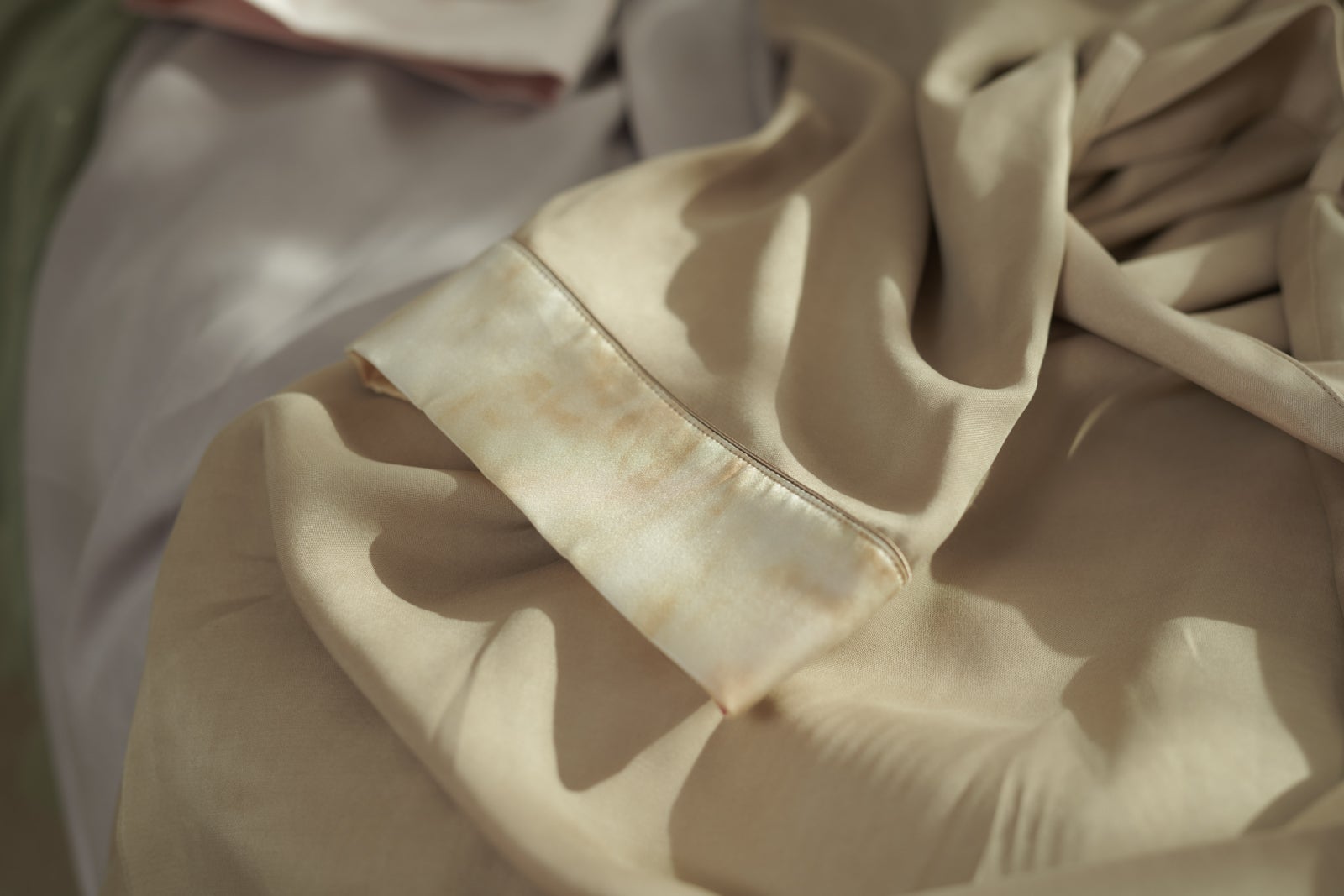 シルクは非常に繊細ですので、洗濯可能のものでも水に浸す時間を極力短くするようお気をつけください。洗濯する際は先にタオルまで準備して、手早く済ませることを心がけ、擦ることで生地にダメージを与えてしまうので、洗う際やすすぎの際は洗濯ネットの上から押すのみで作業を行ってください。