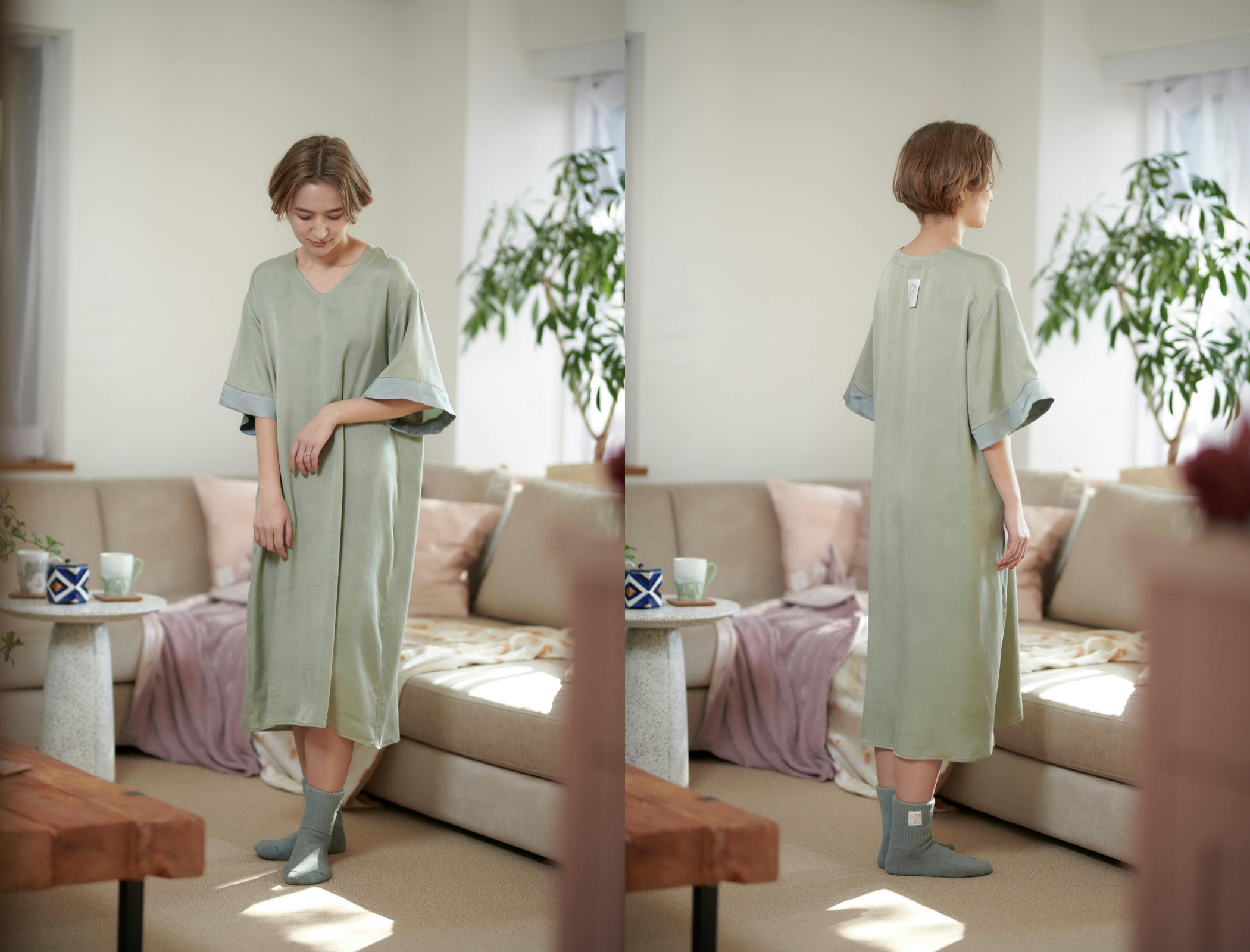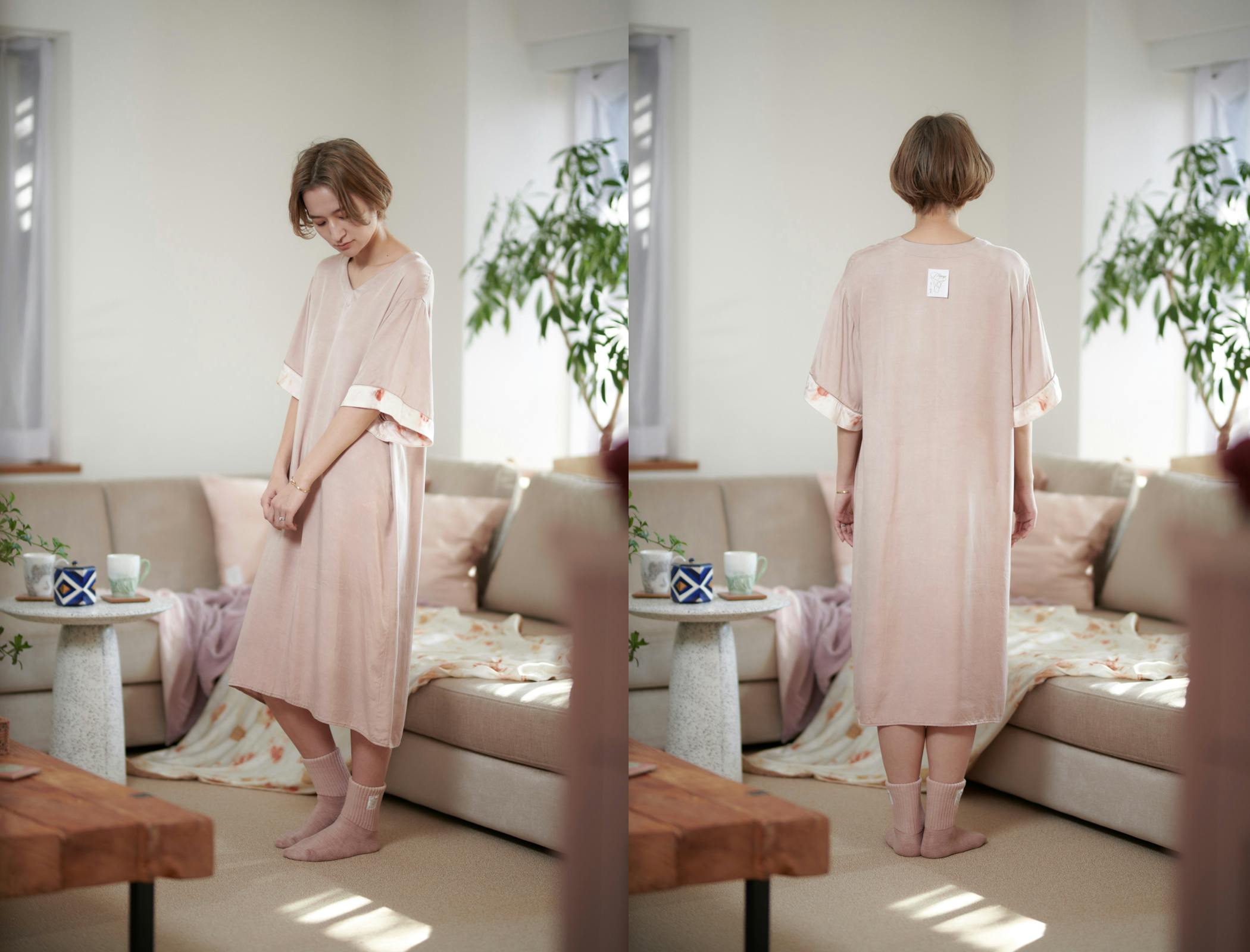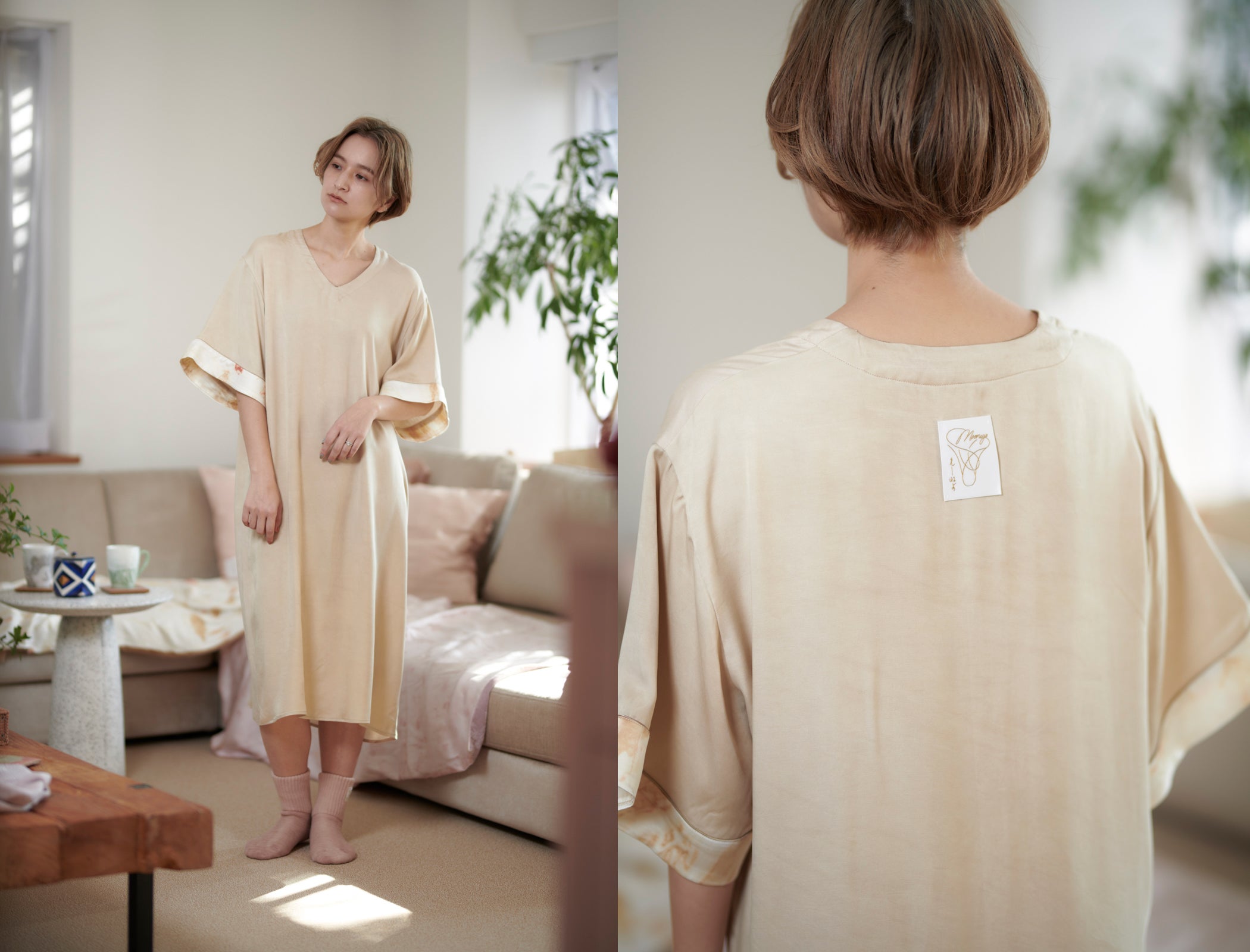 お部屋でのリラックスタイムや、近所のお散歩などちょっとした移動の際に利用いただきたい、上品なワンピースパジャマ。袖口とスカートのフレア部分が女性らしく優しい印象になります。首元や袖口部分に施したコードパイピングが、より上品に仕立て上げています。京都と東京の職人さんが一枚一枚の生地を手作業で、草木染め・花びら染めの技術を使って染め上げています。より花を身近に感じるため、袖部分は国産シルクの上に花びら染めを施しております。花に包まれた気持ちになる極上のラグジュアリー時間をお楽しみください。