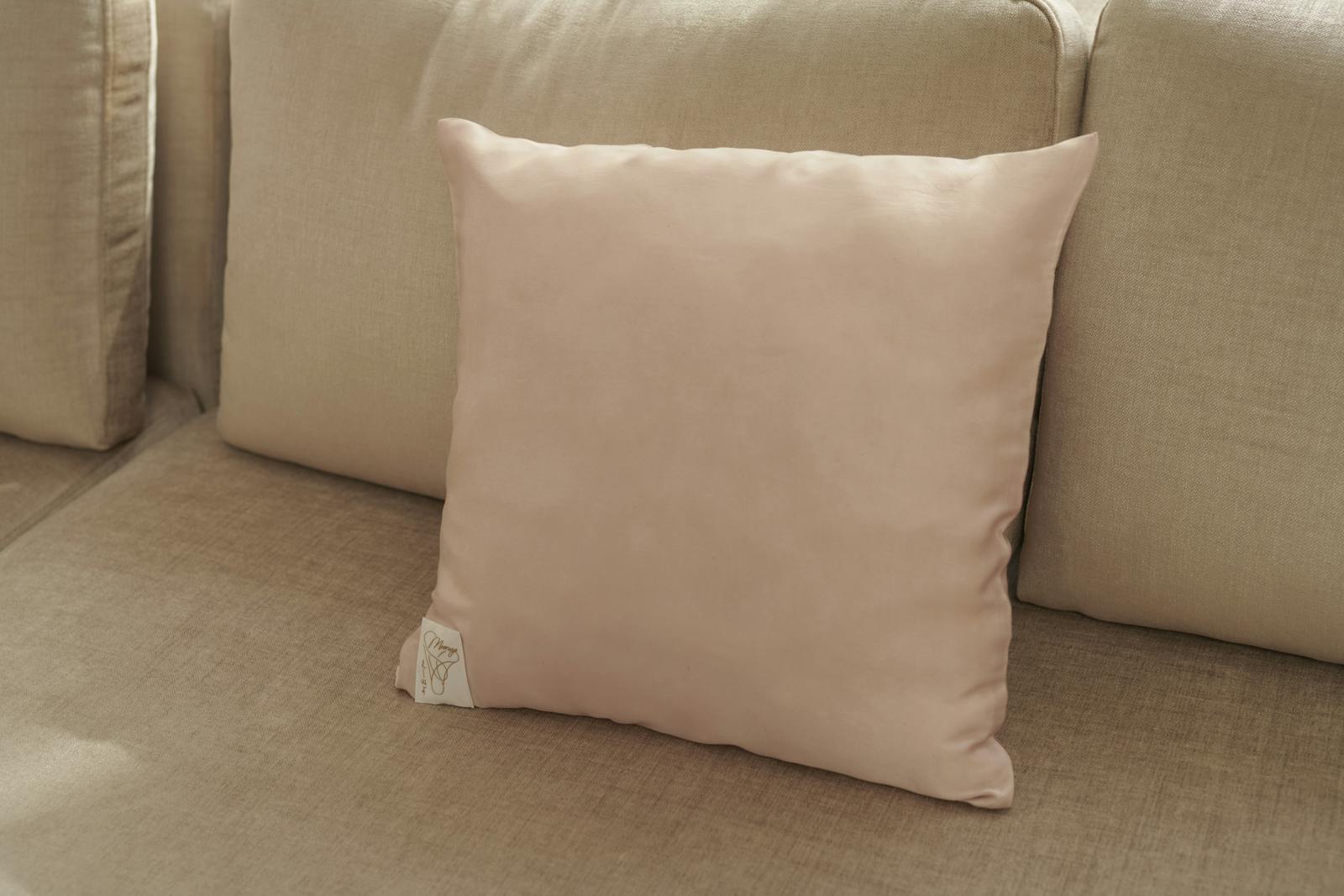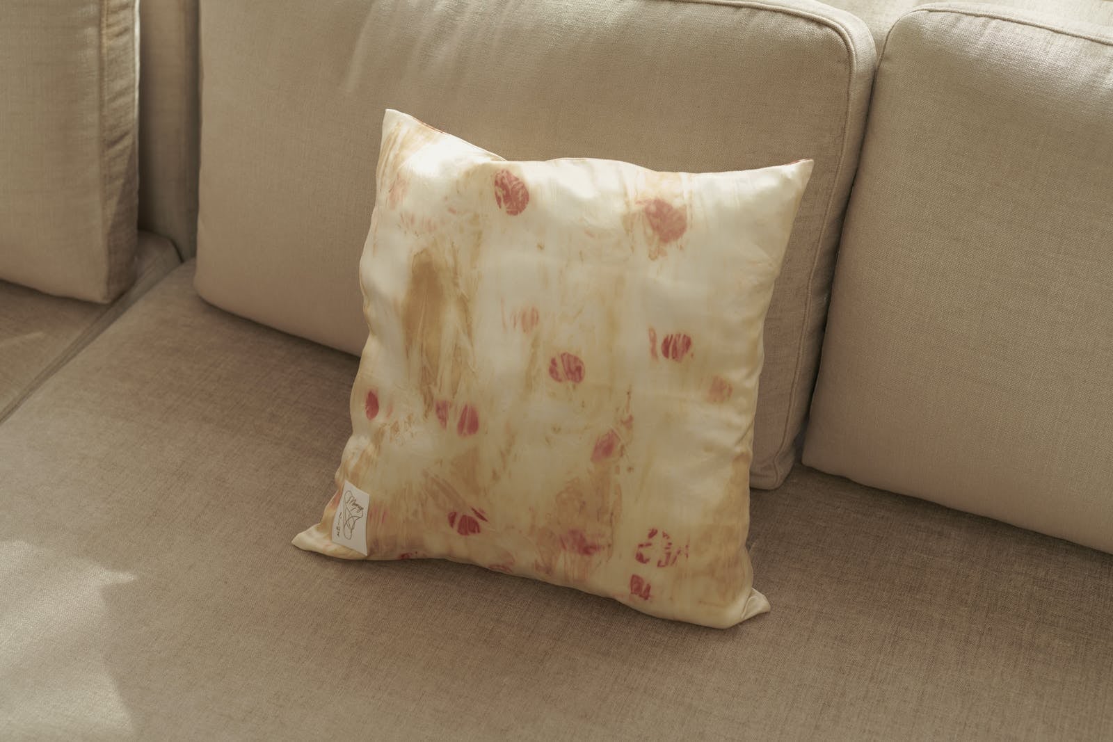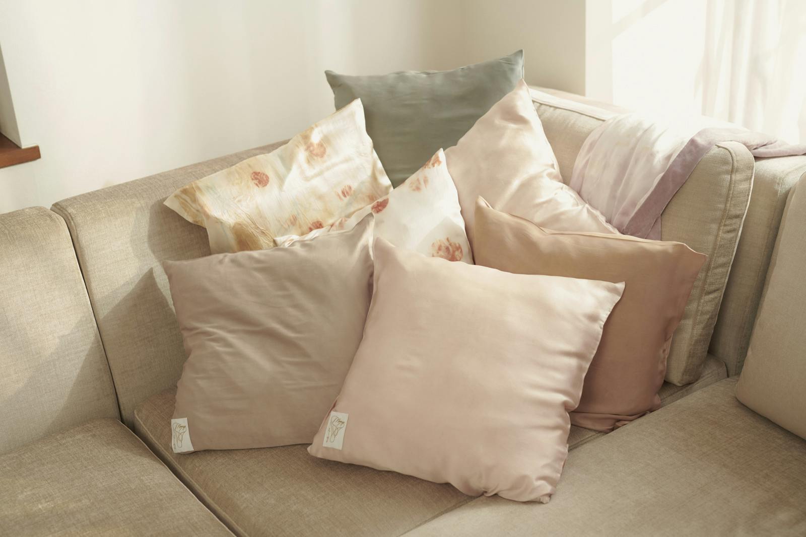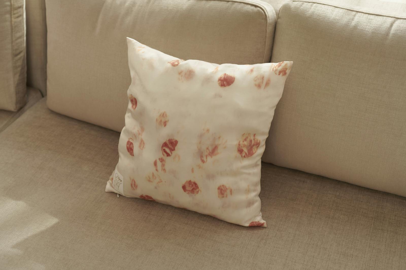 京都と東京の職人さんが一枚一枚の生地を手作業で、草木染め・花びら染めの技術を使って染め上げているクッション。染めた後は、国産シルクを国内縫製工場にて丁寧に縫製しています。ファスナーは外側から見えにくいコンシールファスナーを採用。花のもつ優しさに包まれる極上体験を楽しんでください。