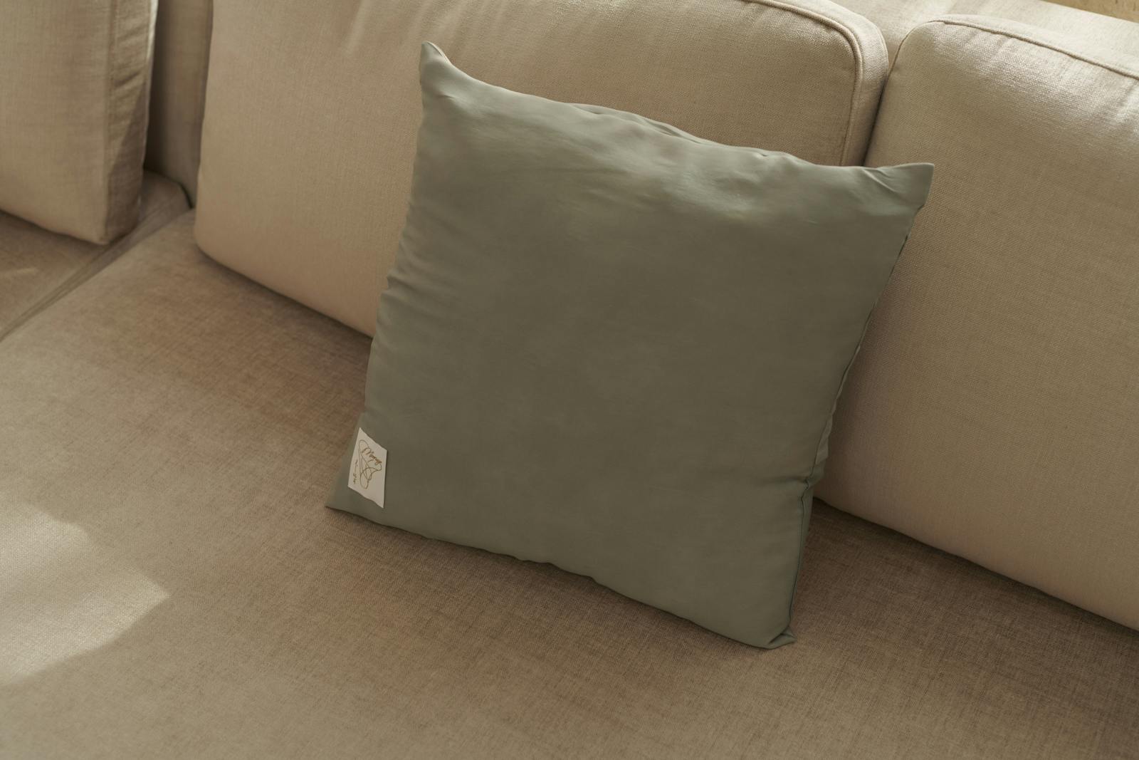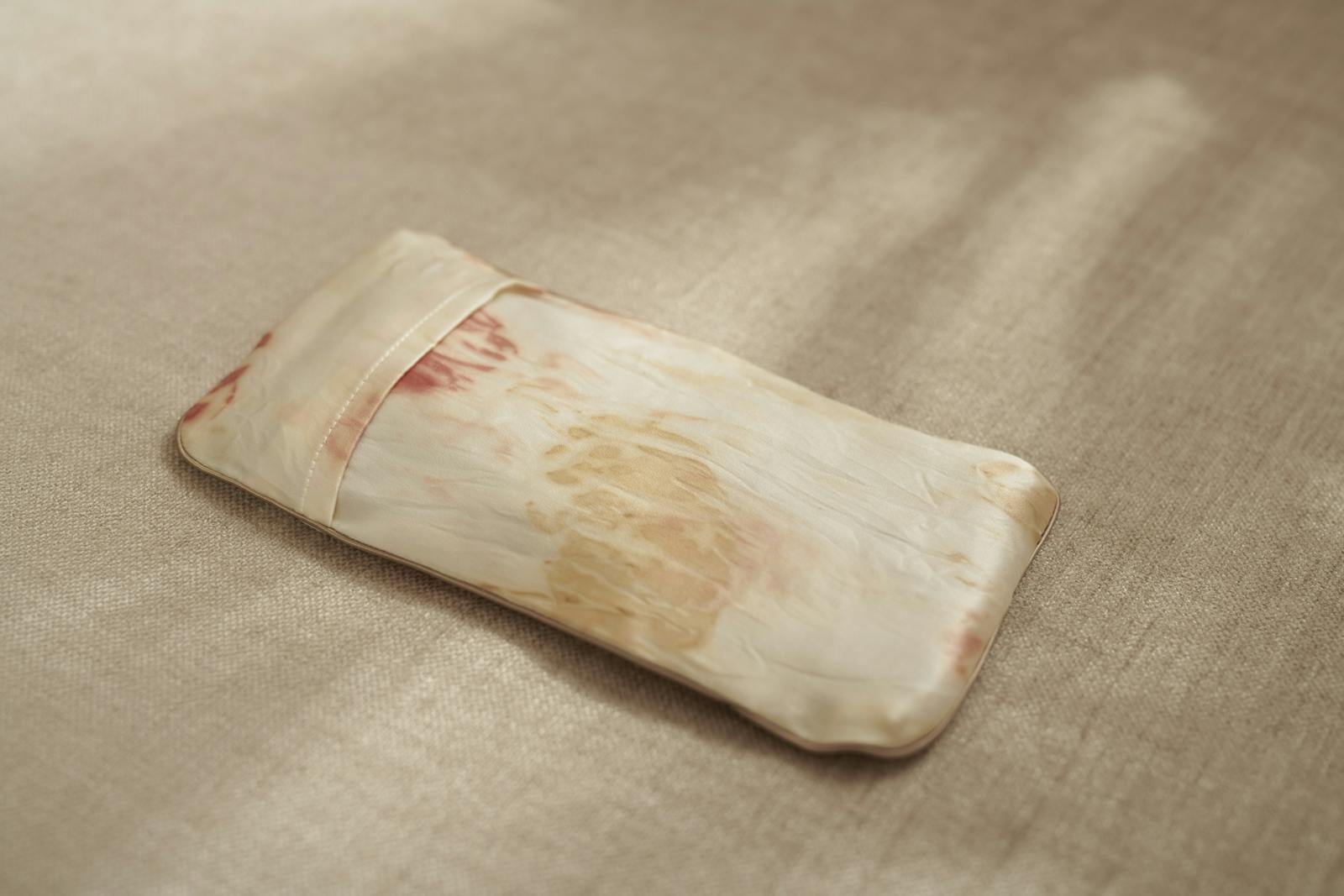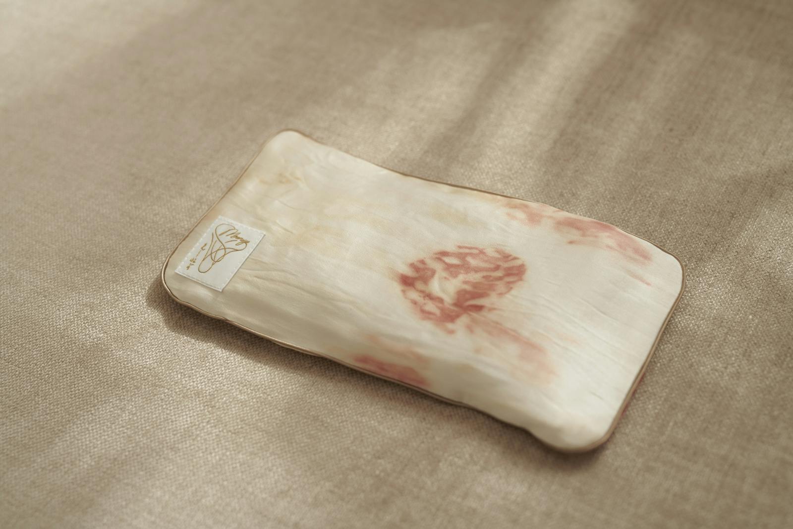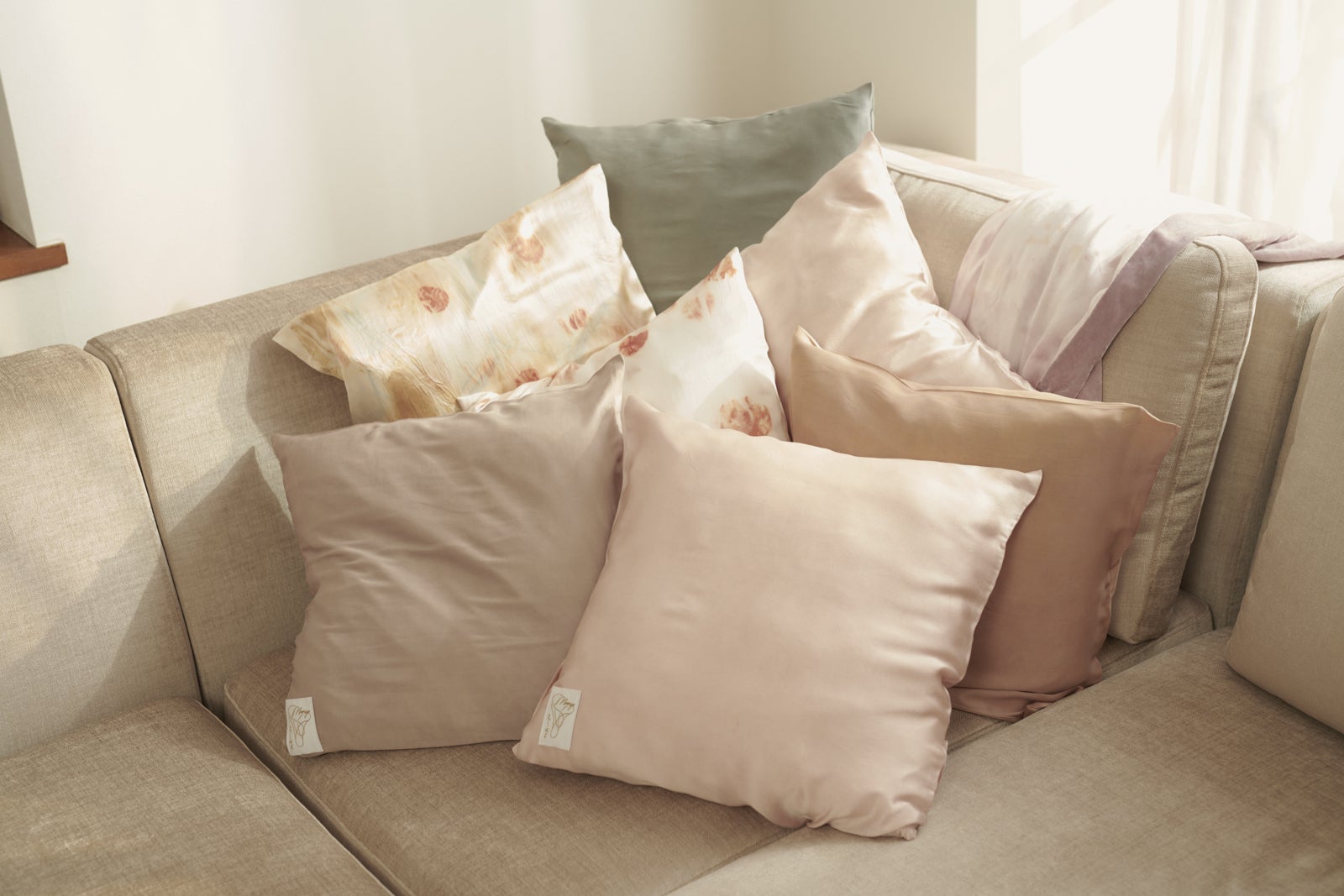 京都と東京の職人さんが一枚一枚の生地を手作業で、草木染め・花びら染めの技術を使って染め上げているクッション。染めた後は、国産シルクを国内縫製工場にて丁寧に縫製しています。ファスナーは外側から見えにくいコンシールファスナーを採用。花のもつ優しさに包まれる極上体験を楽しんでください。