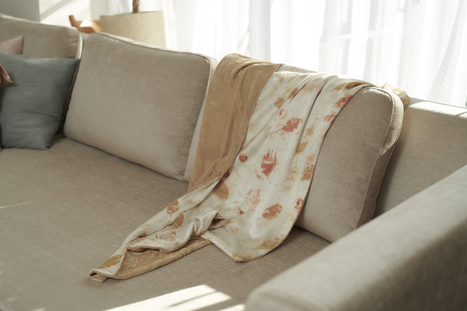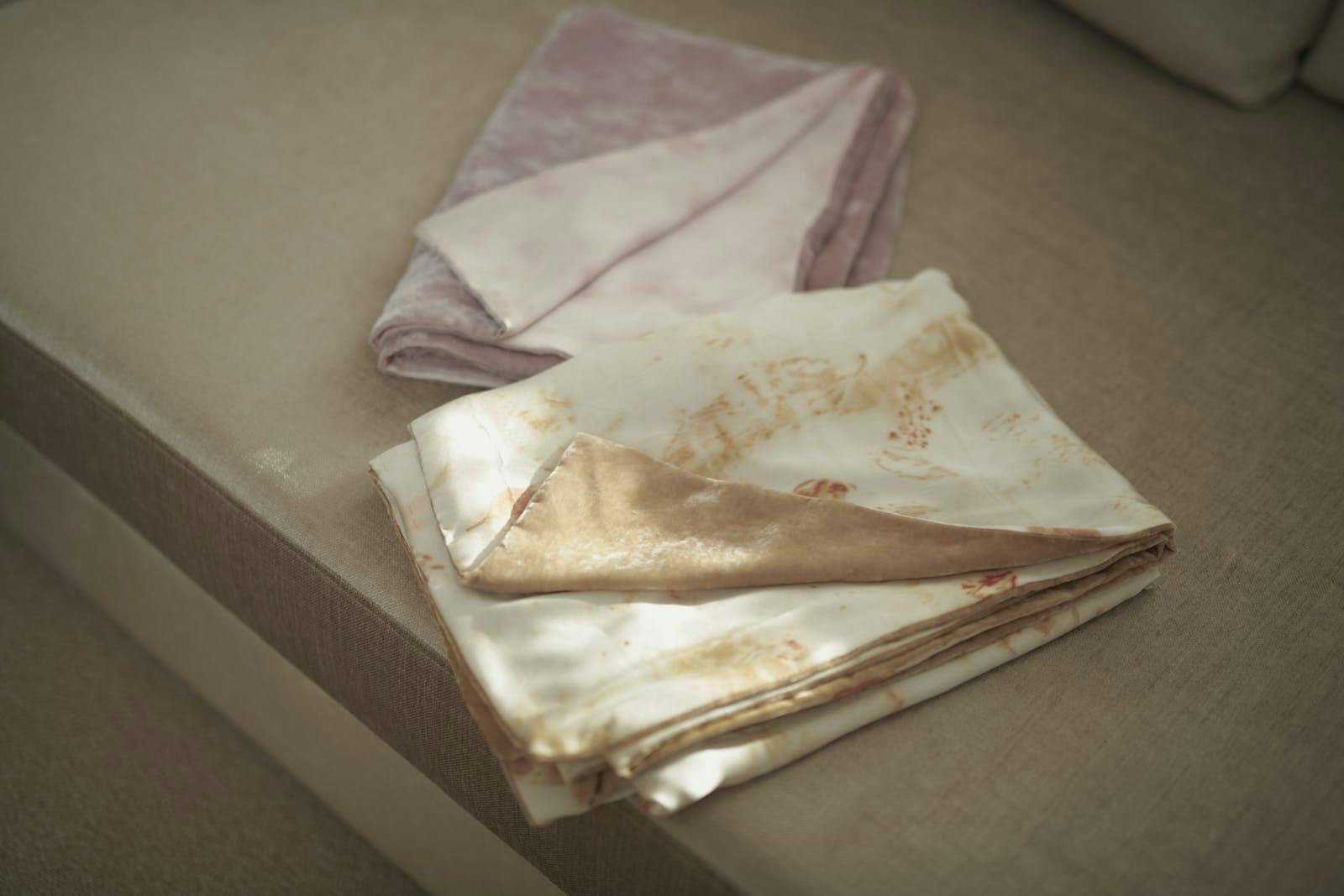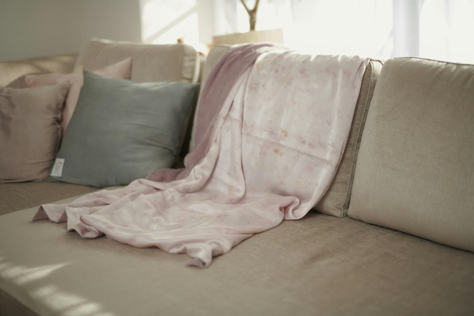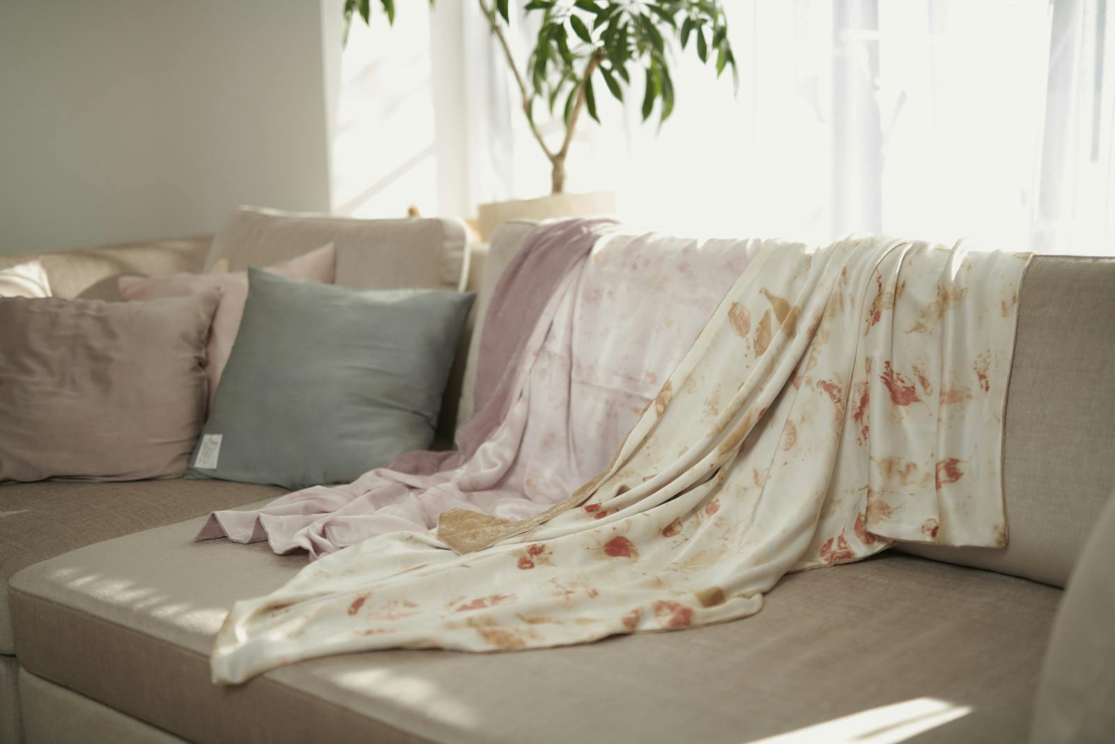 国産シルクとベルベットを組み合わせて作った、高級ブランケット。シルク部分は東京の染織アトリエで花びら染めを行い、ベルベット部分は京都の染織企業の工房で職人さんが草木染めを行っています。高度な縫製は、国内縫製工場にて丁寧に縫い合わせています。軽やかだけどふんわり柔らかい、花のもつ優しさに包まれる極上体験をお楽しみください。