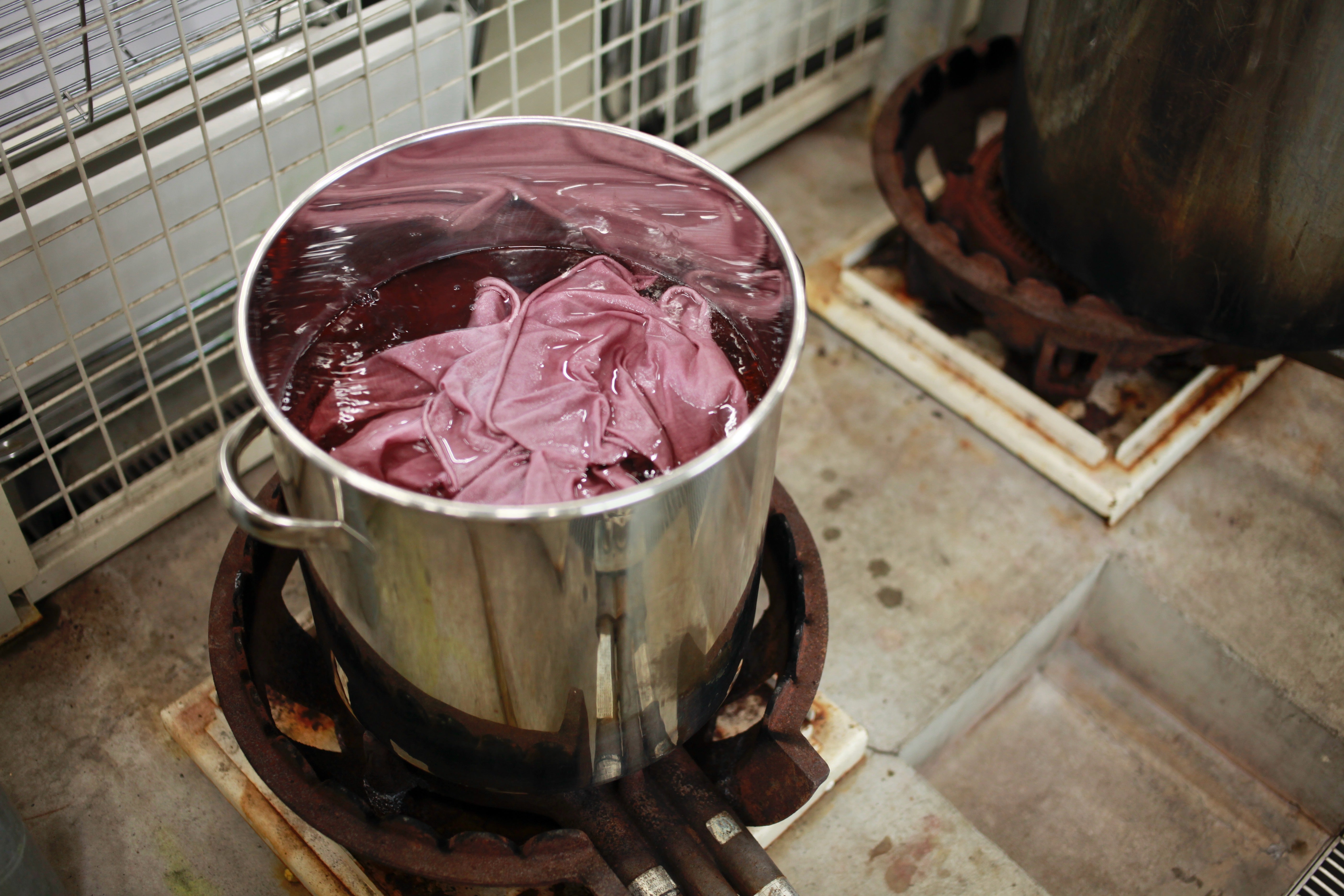 「mooneyo」の商品に使用しているのは、自然の色を抽出してつくった染料で、糸や布を染める「草木染」です。化学染料とは違い、植物から抽出した色はさまざまな形、大きさの色素が含まれているため、光の当たり方によって色合いなどが違って見えます。また、植物を採集する季節や育った場所によっても染まる色に変化があります。