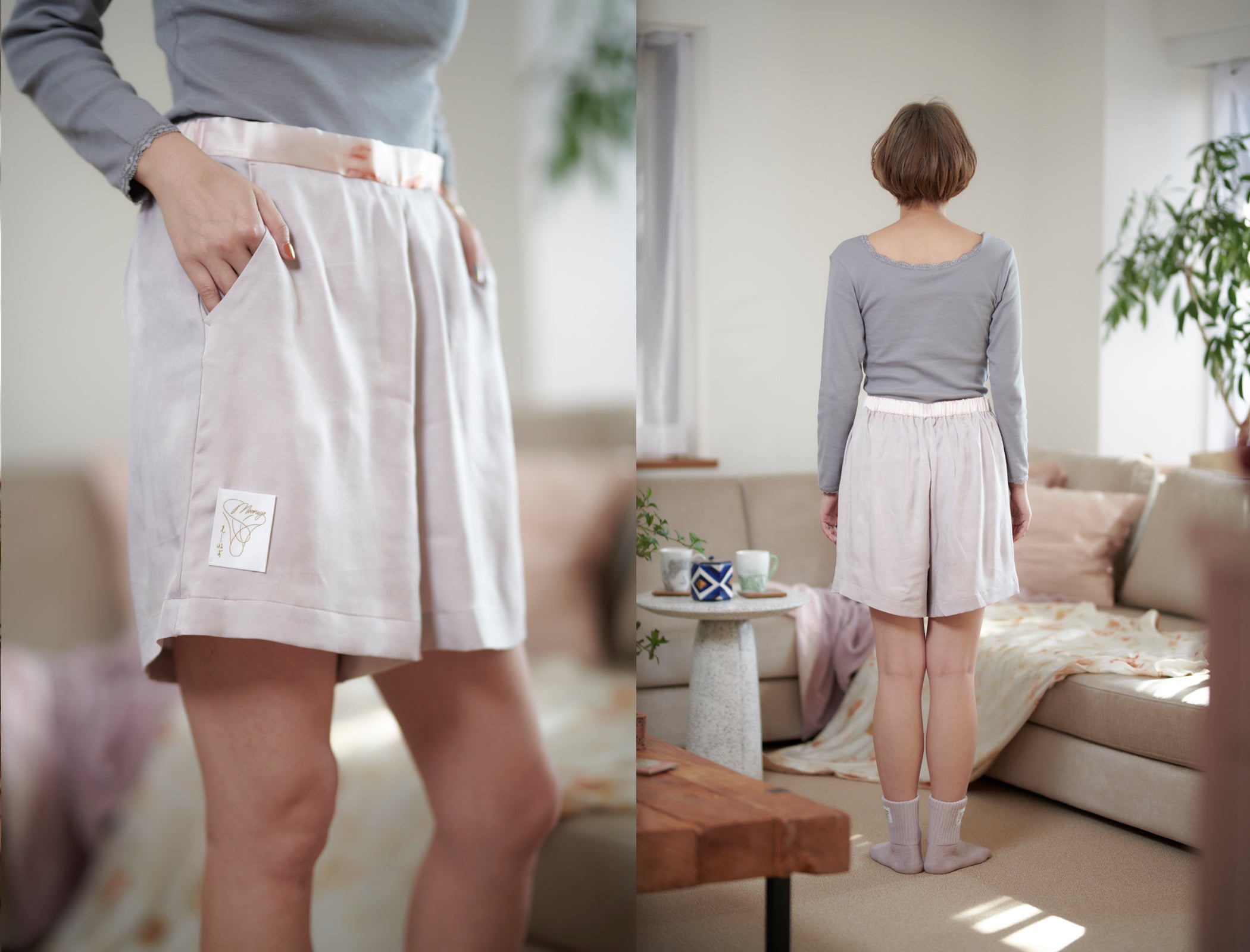 あたたかい季節にTシャツの下に合わせて着るもよし、ワンピースの下に履くもよし。両サイドにポケットがついていて、便利に着まわせるショートパンツタイプのパジャマ。ウエスト部分には、ふとめの幅の平ゴムを施し、花びら染めを施しており、様々な体型の方にご着用いただけます。(平置き状態のウエスト幅 70cm・広げた際のウエスト幅101cm)