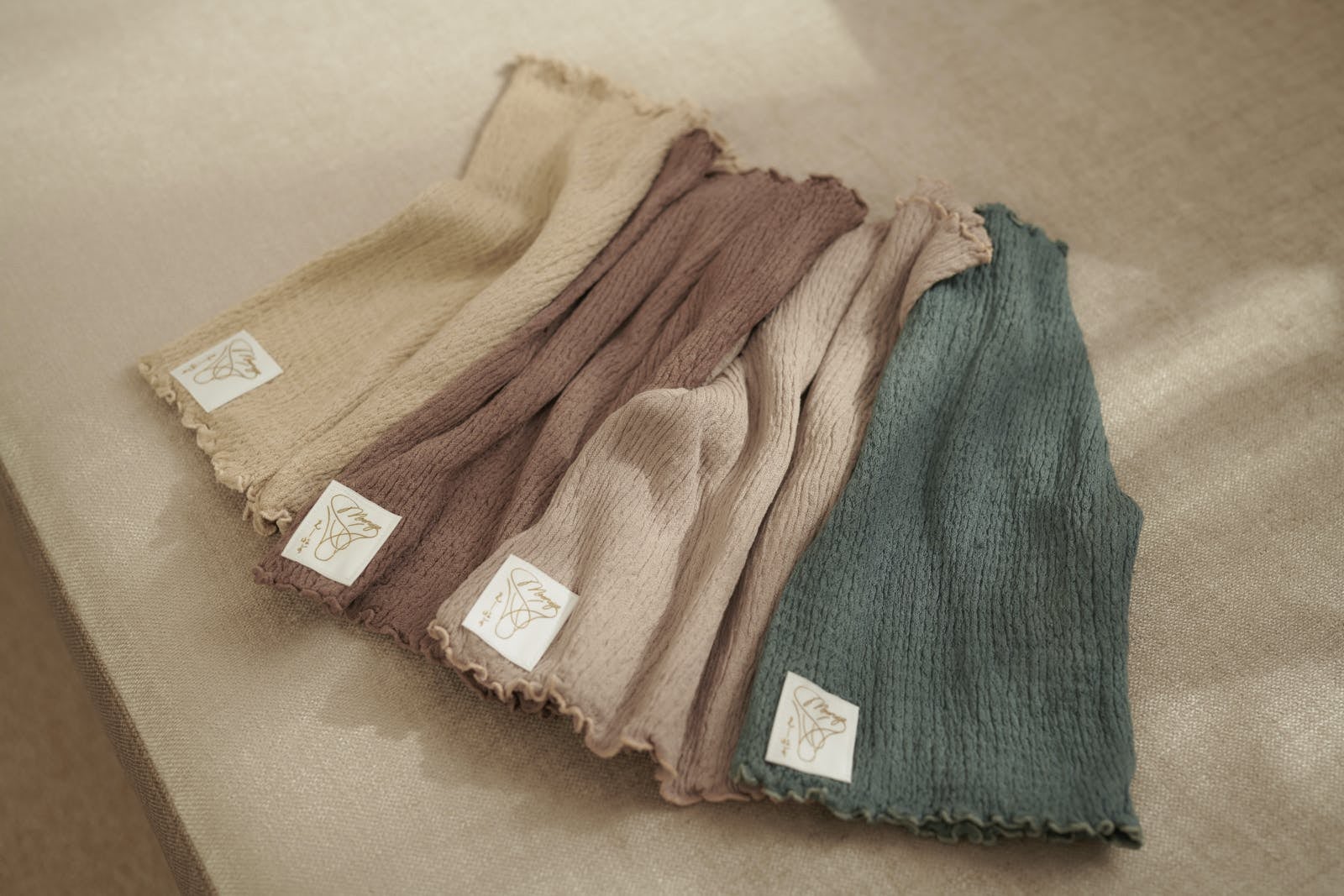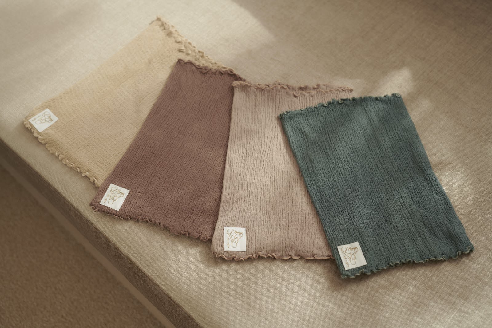 細繊度の絹紡糸からできた、極薄でとってもなめらかなシルク腹巻に、京都の職人さんが草木染めをおこなっています。国内の編み立て工場で丁寧に編み上げられた腹巻は、人肌に近いあたたかさ、肌にずっと当てていたくなるほどのなめらかさ、生地の厚みにこだわっています。