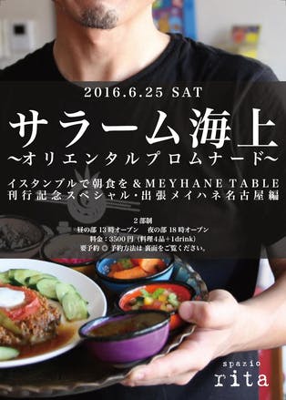 名古屋 Spazio Ritaにて恒例となったサラームの出張メイハネ。いつも予約にあふれてしまう人がいるほど人気のイベントとなりました。ありがとうございます。そこで今回はお昼の回と夜の回、一日二回を行います。定員は20名ずつなので、ゆったり食事をお楽しみいただけますよ! この機会に是非どうぞ!