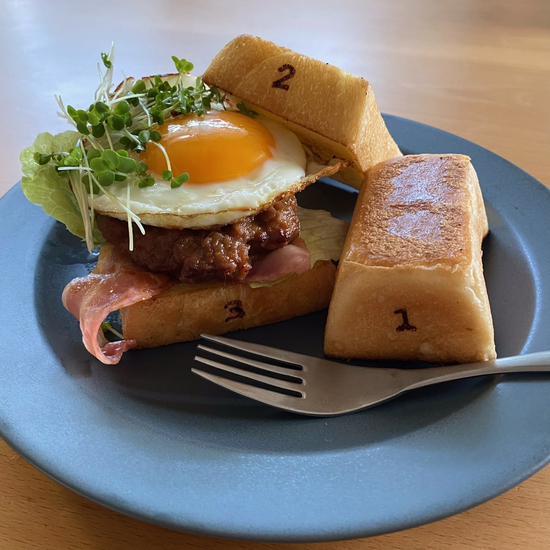 その間に目玉焼きとベーコンをフライパンで焼いて取り出し、