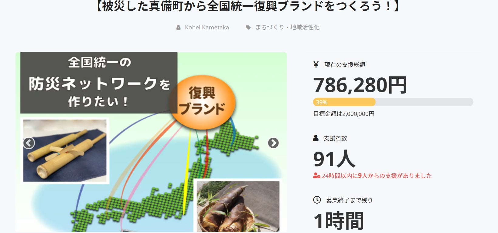 残り15分となりました!2月1日になった時点で、防災ネットワークの中身やブランドについて決めていきます!ご支援/ご協力して下さった方々、必ず実装いたします。本プロジェクトのみならず、今後㈱Bounce backとして真備町より全国へ真備発の全国統一復興ブランド・防災ネットワークの構築を図ります。今回集まった資金より、重機等購入予定です。加えて、特設サイトの制作にも取り掛かります。サイト実装、楽しみにしておいてください!ということで、残り15分あがきます!応援宜しくお願いいたします!