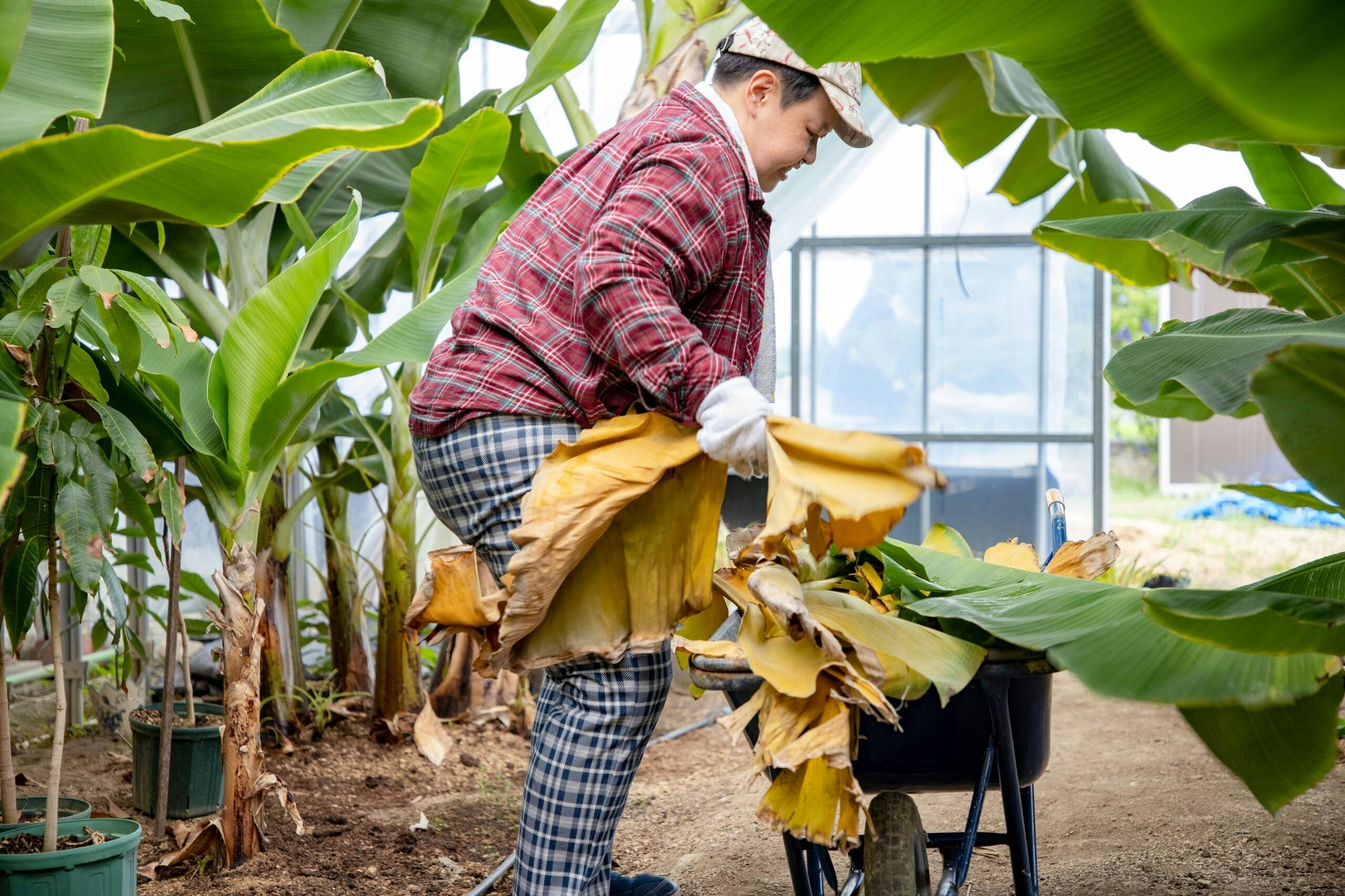 毎日暑い日が続いていますが、農園のバナナも暑さのなか頑張っています。夏になると一段と成長も早く3日に1枚新しい葉っぱが生まれます。同時に古い葉っぱは枯れていきます。暑い中農園の中の作業は汗だくですが、こうして葉っぱを集めてくれる方がいます。みんなの力を借りてこそのバナナ栽培と思います。