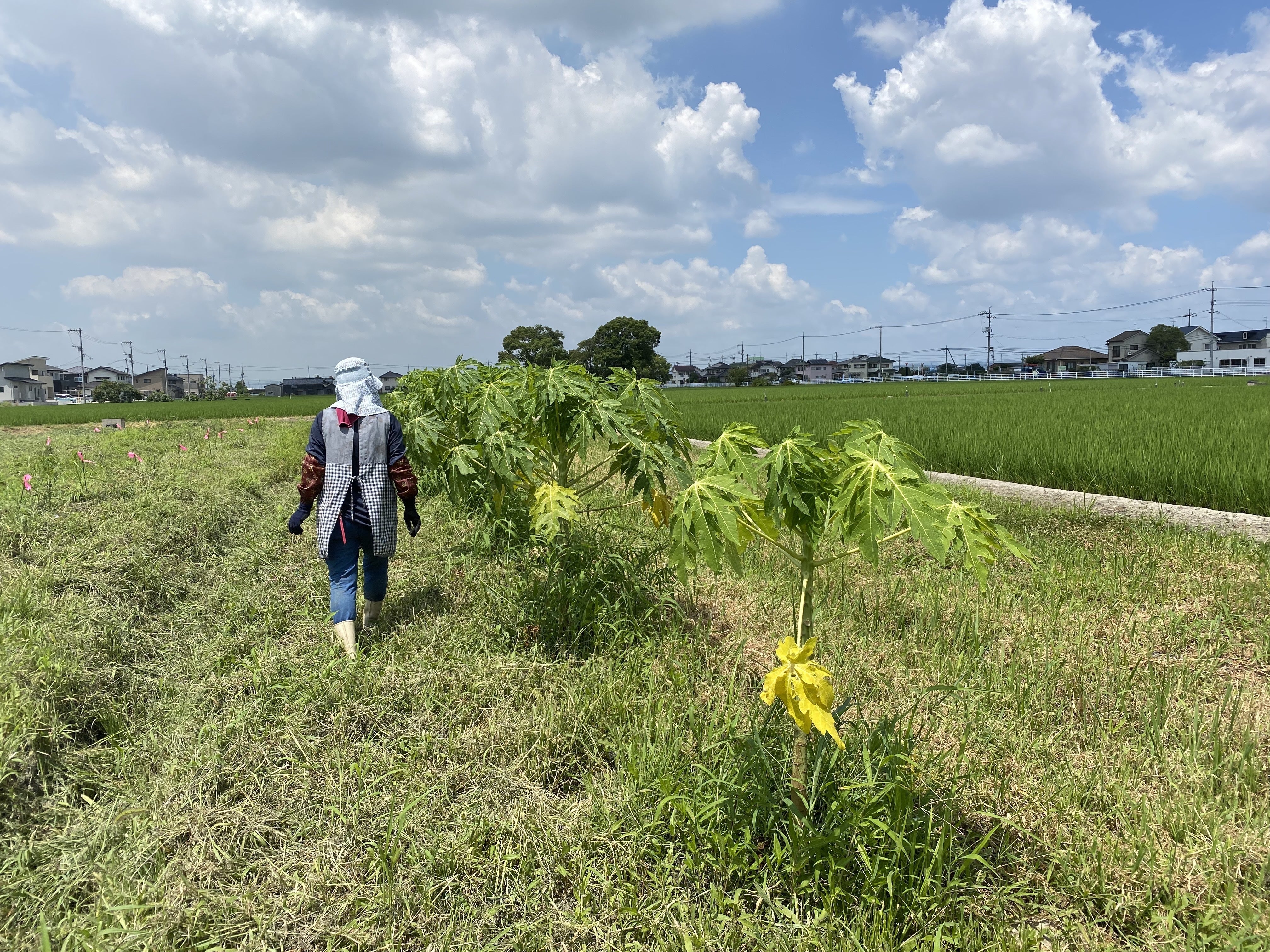 本日の支援をいただきありがとうございました。 4月に開墾し 5月にパパイヤの植え付けをしました。あっという間に身長の高さまで成長しました。秋には青パパイヤが収穫できます。パパイアは1年草だから 露地植えでも十分収穫できます。