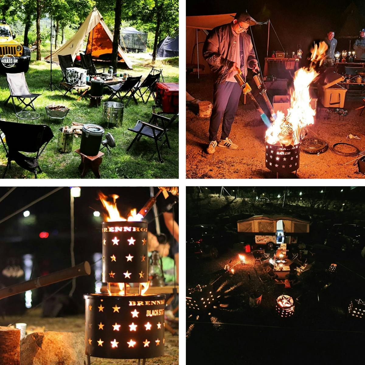 圧倒的な存在感を放つ筒状の焚き火台「BLACK STAR」。キャンプ場をオシャレに彩るデザインは、焚き火を楽しみながら見る者をワクワクさせてくれます。筒状の為、360度どこからでも眺めを楽しむことが可能です。
